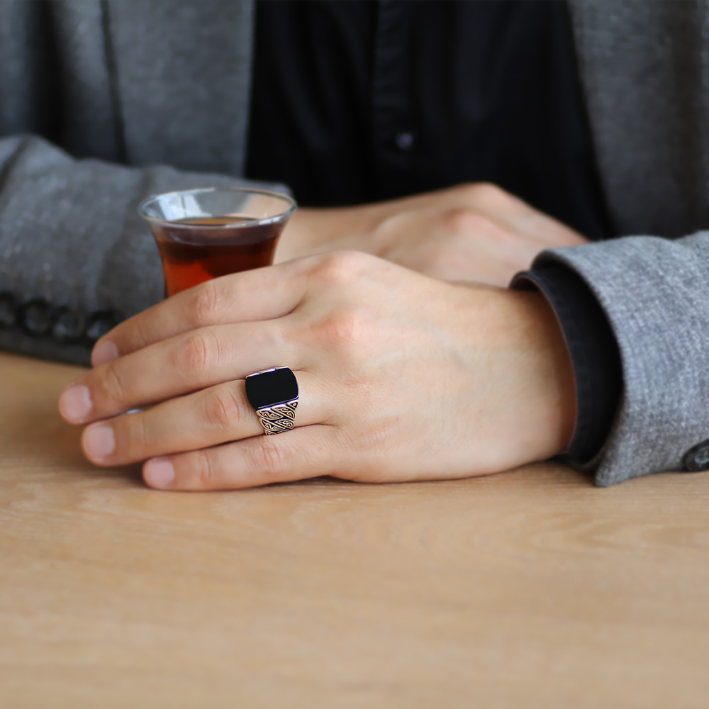 Sarmaşık Tasarım Siyah Oniks Taşlı 925 Ayar Gümüş Erkek Yüzük