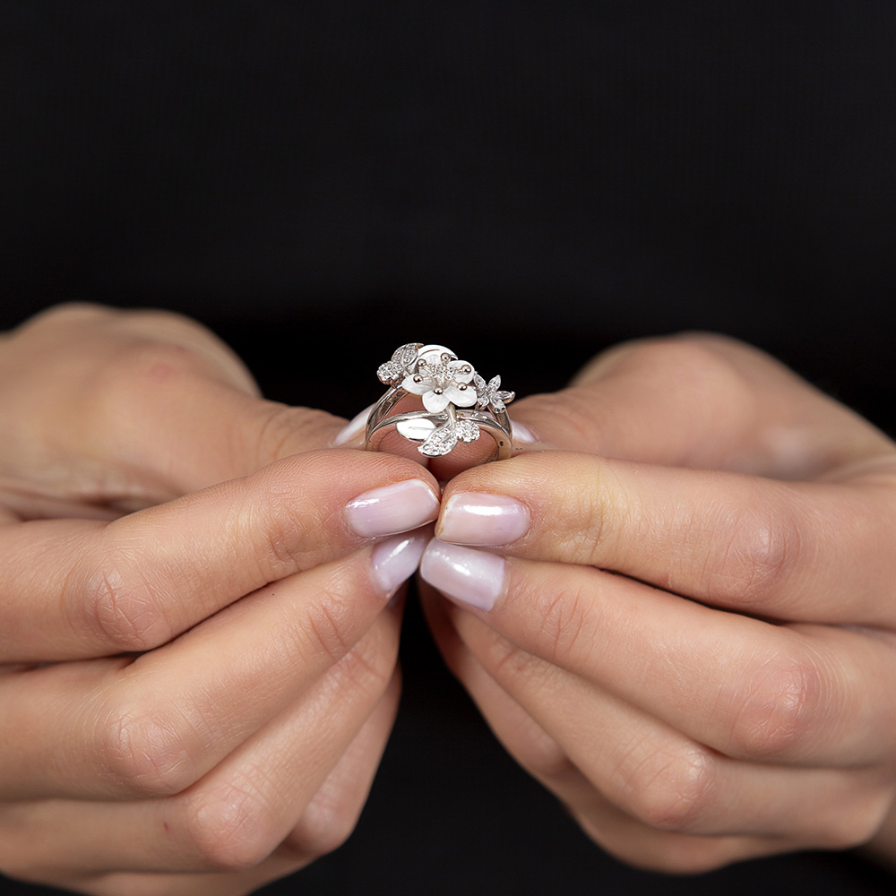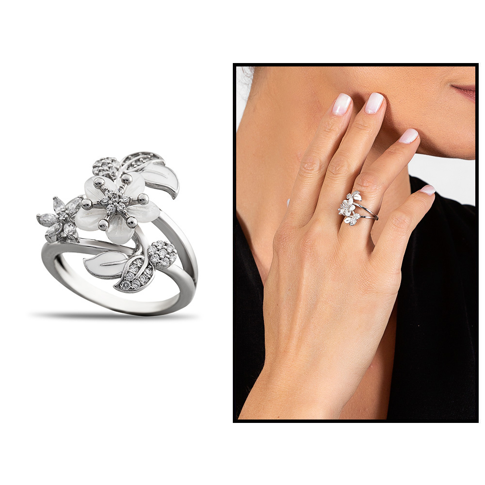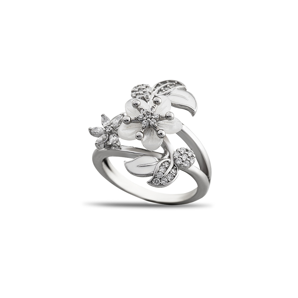 Sedef Taşlı Kır Çiçeği Tasarım Yaprak Detaylı 925 Ayar Gümüş Kadın Yüzük
