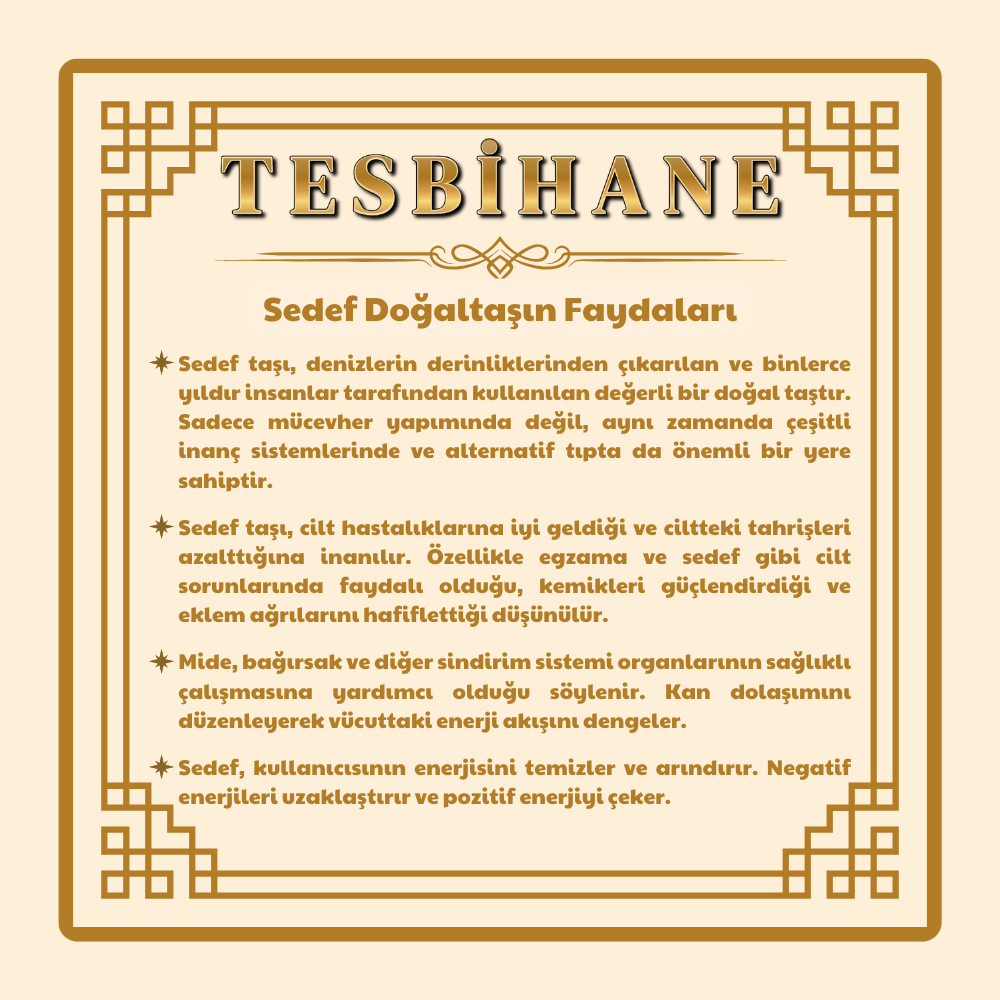 Organik kökenli bir taş olan sedef, deniz canlılarının doğal yapılarından oluşur. Sakinleştirici etkisiyle bilinir. Vücut dengesini ve iç huzuru desteklediğine inanılır. Duygusal dengeyi korumaya yardımcı olabilir. Ayrıca kişinin çevresine karşı olumlu yaklaşım sergilemesini desteklediği düşünülür. Zarif görünümü sayesinde aksesuar olarak da sıkça tercih edilir.