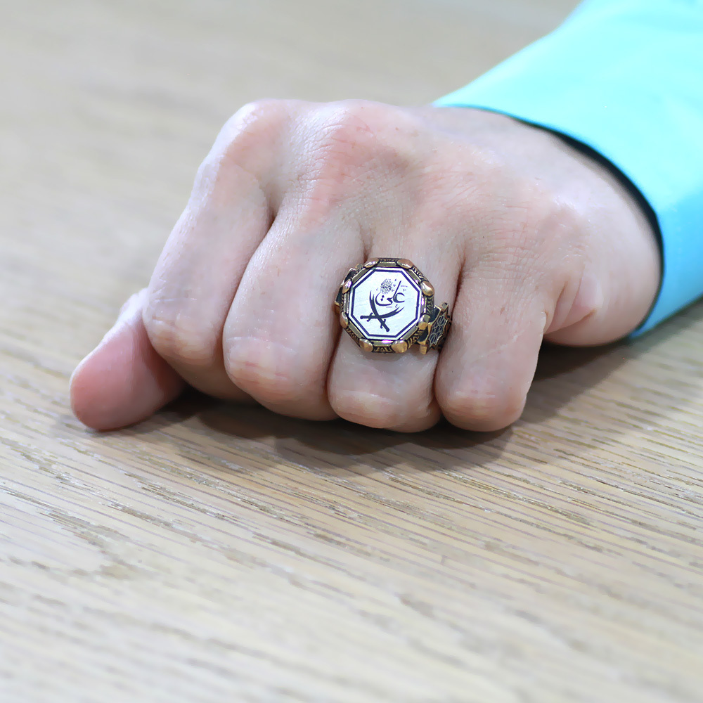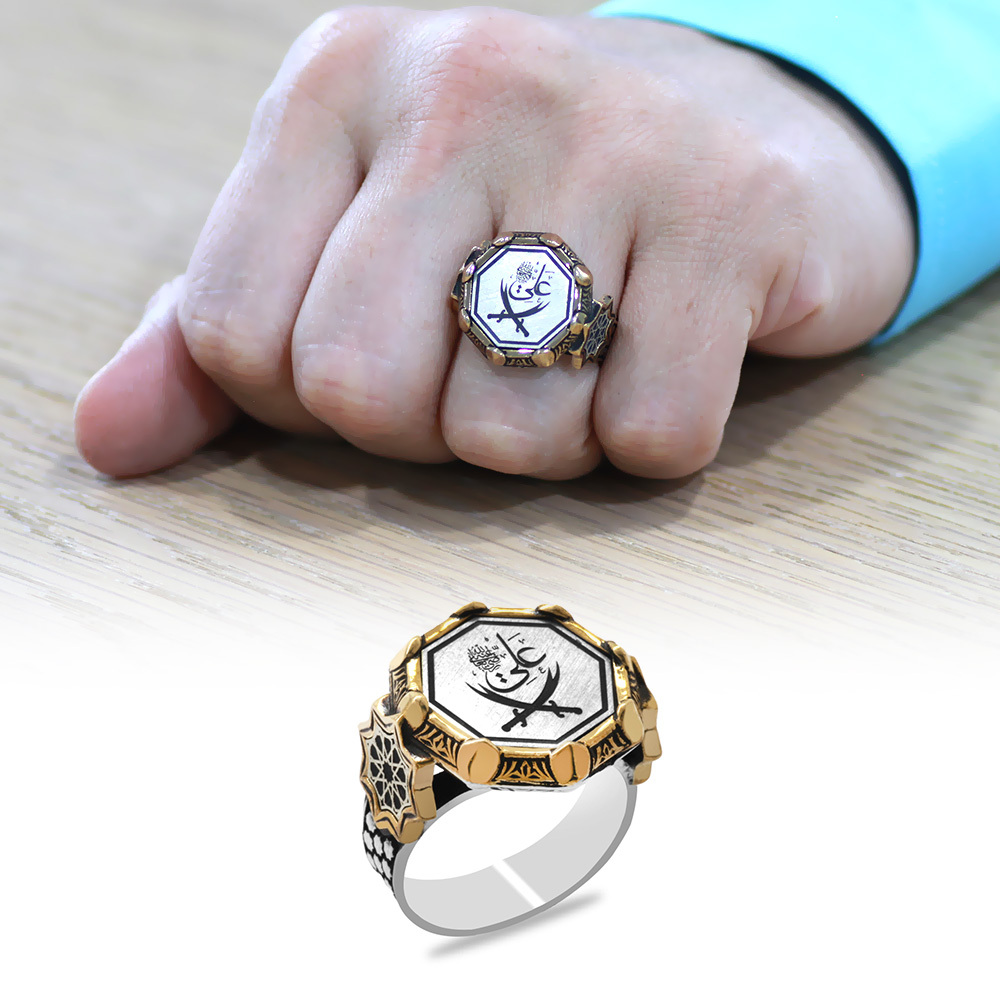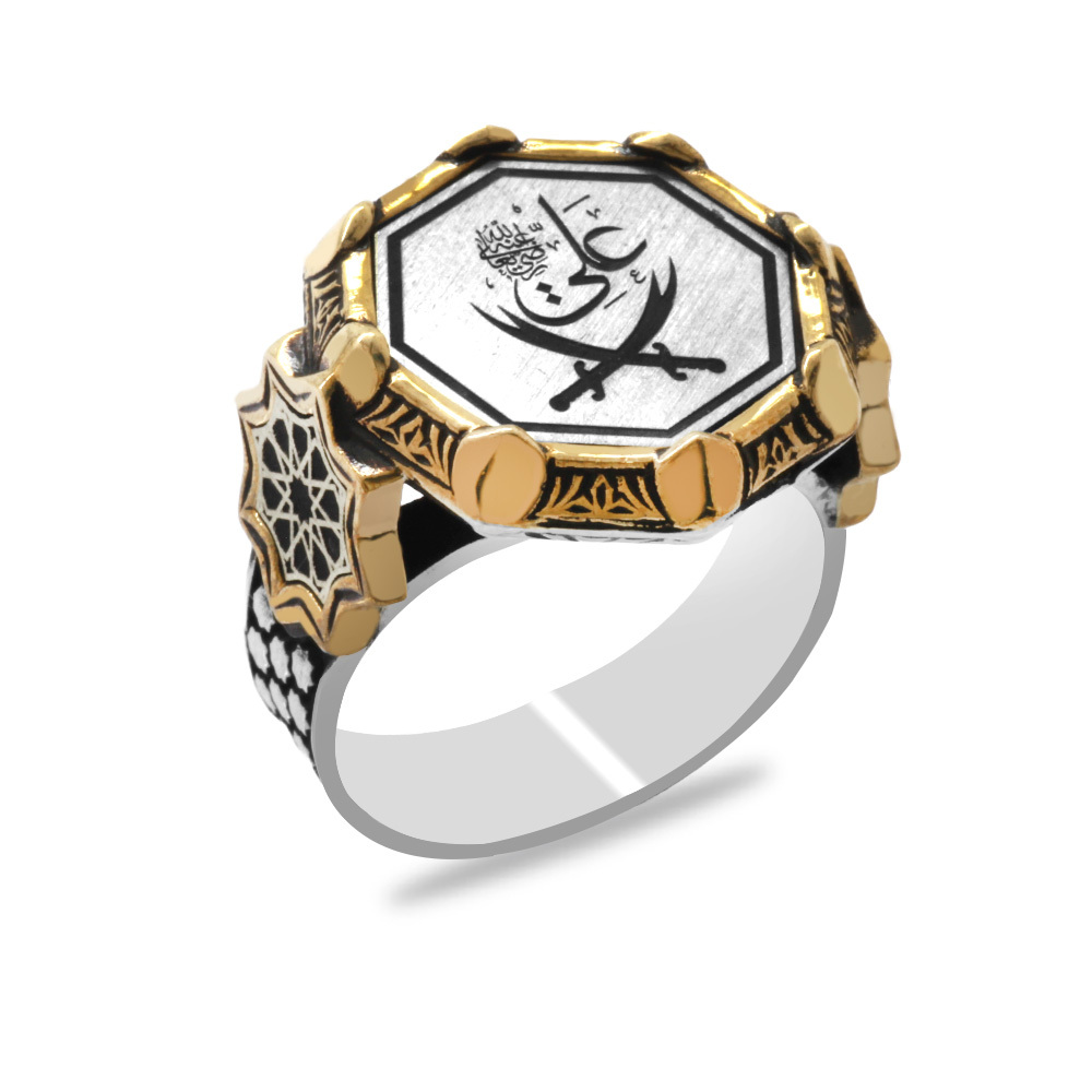 Sekizgen Zülfikar Süslemeli Kenarları Selçuklu Deseni Arapça Ali Yazılı 925 Ayar Gümüş Erkek Yüzük