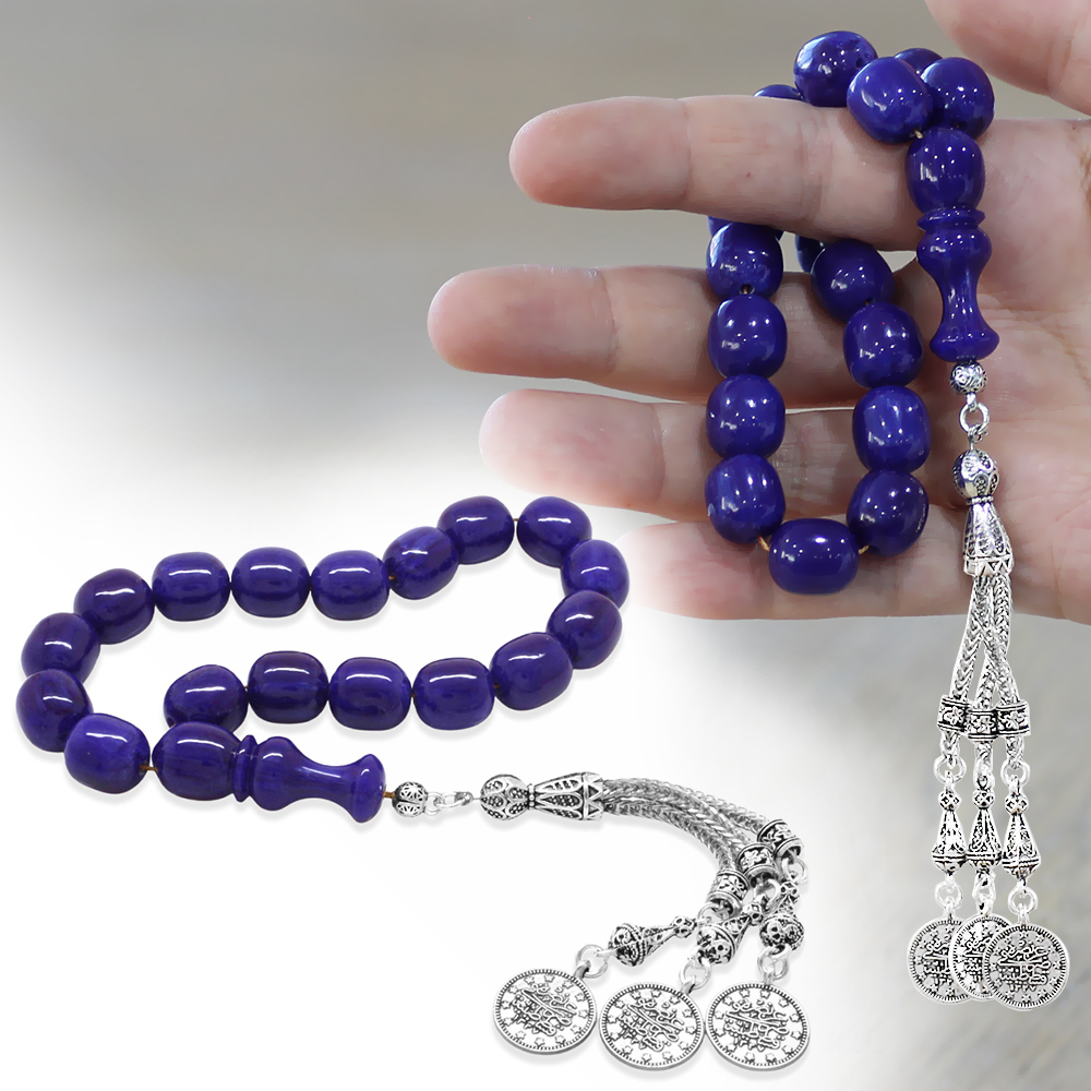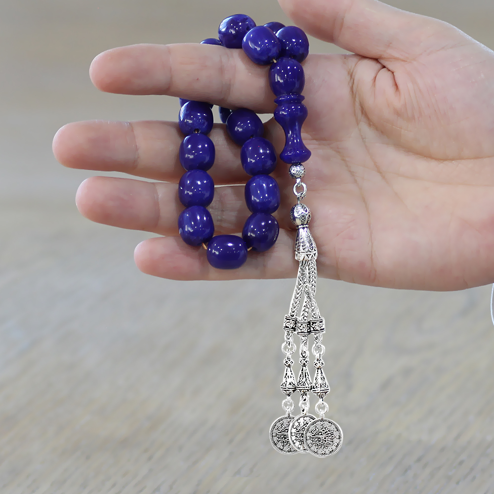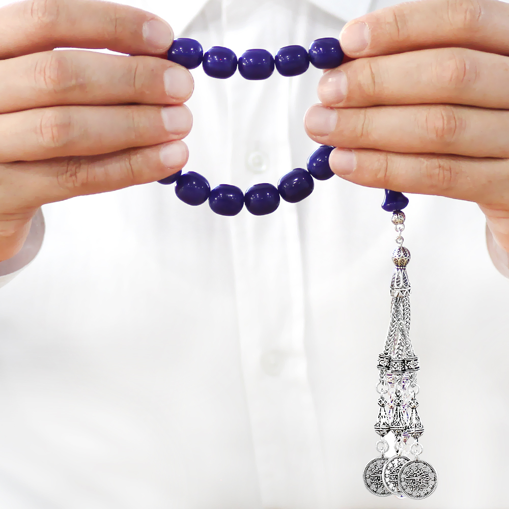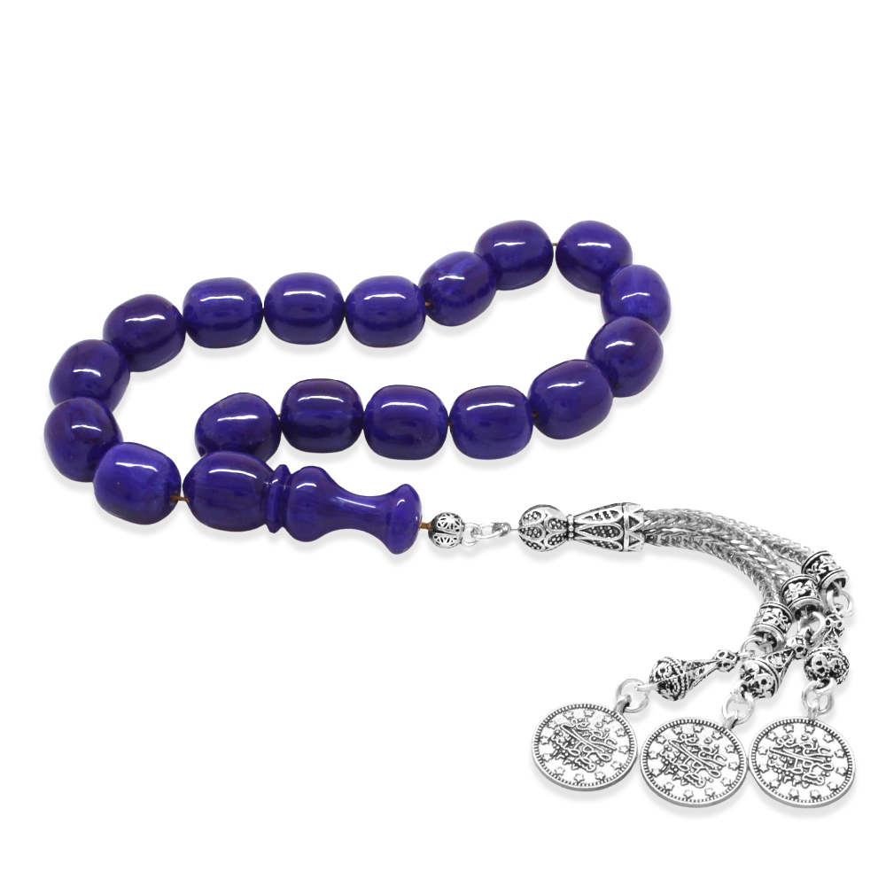 Sıkma Kehribar Efe Tesbih - 3 Kamçılı Kararmaz Metal Püsküllü - Lacivert Renk - Kapsül Kesim