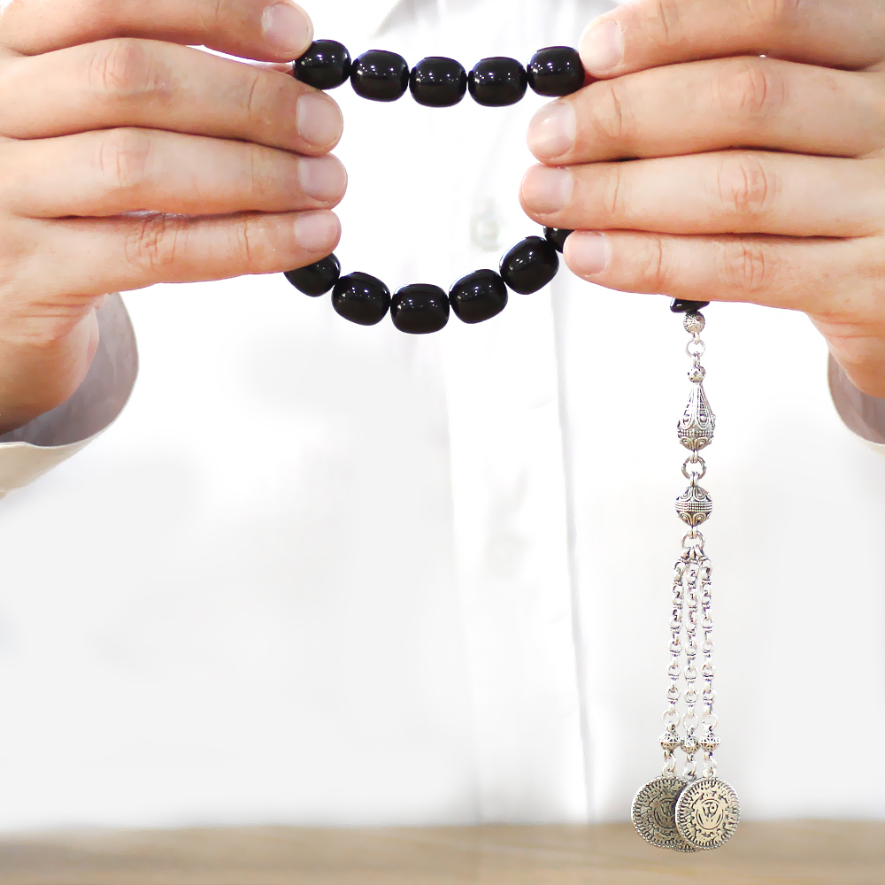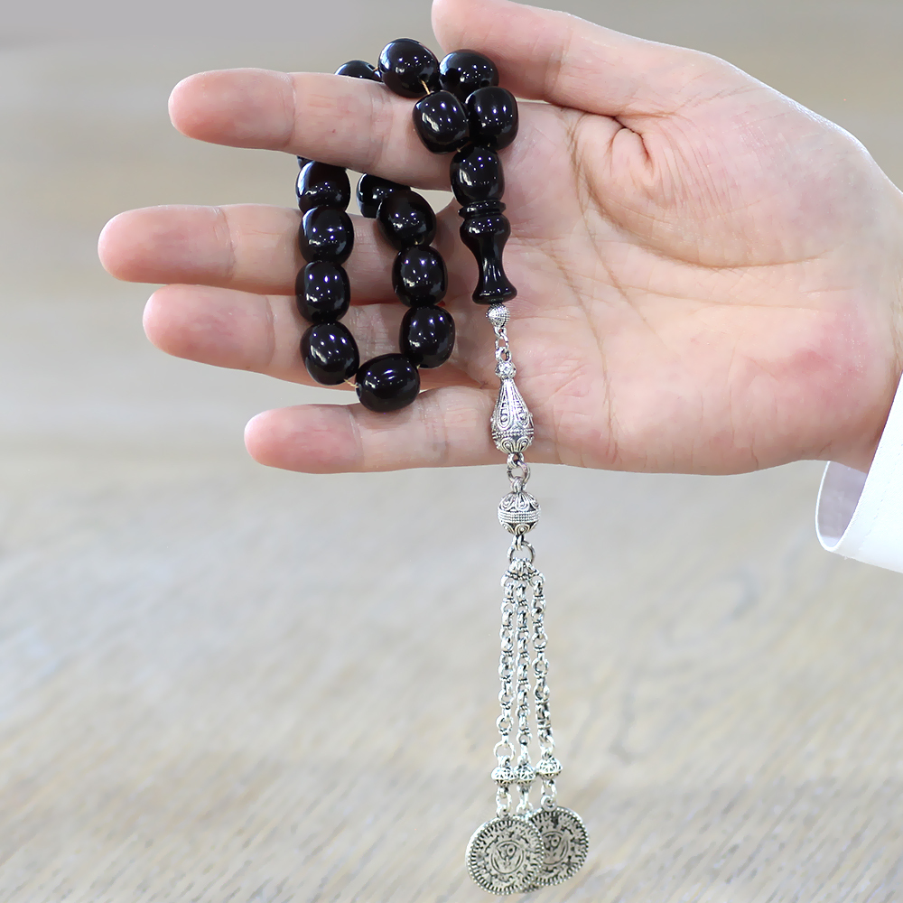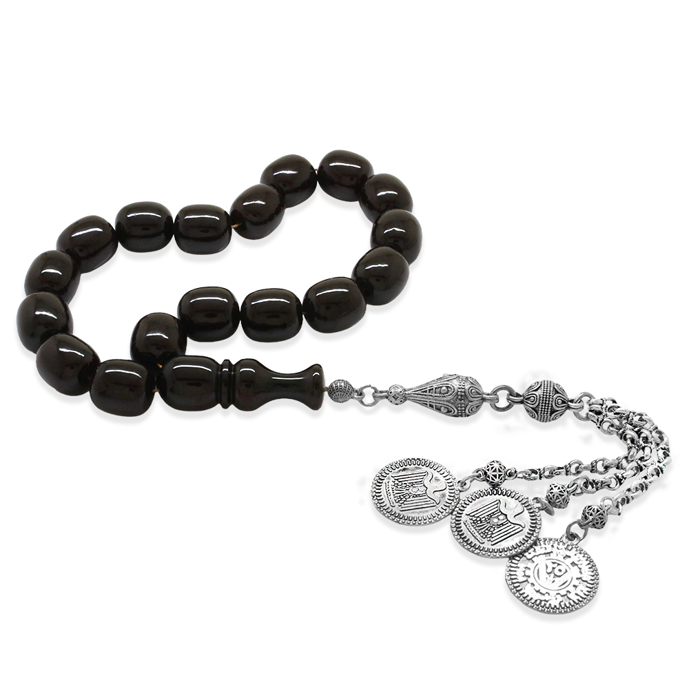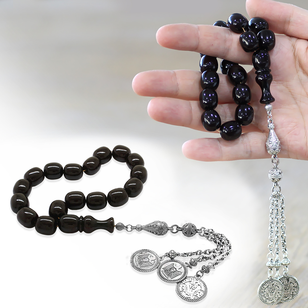 Sıkma Kehribar Efe Tesbih - 3 Kamçılı Kararmaz Metal Püsküllü - Siyah Renk - Kapsül Kesim