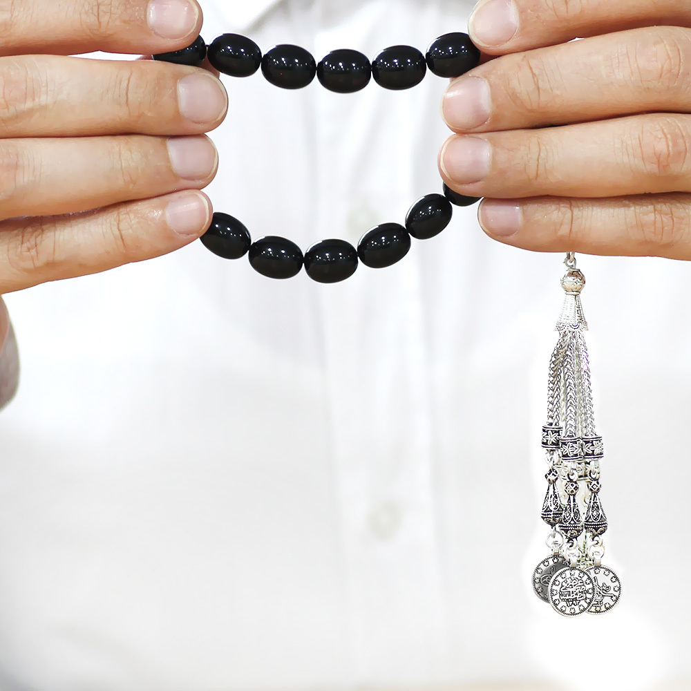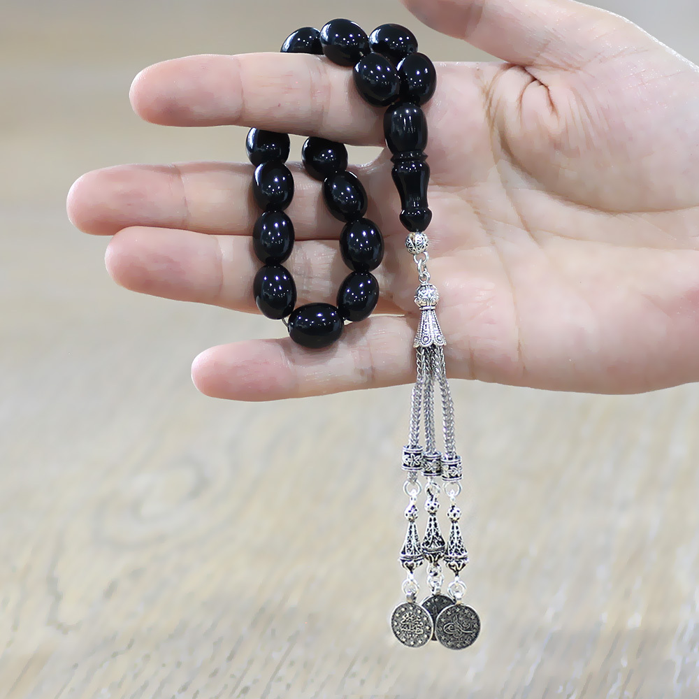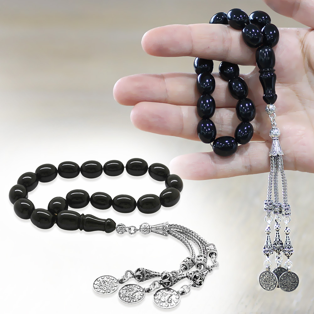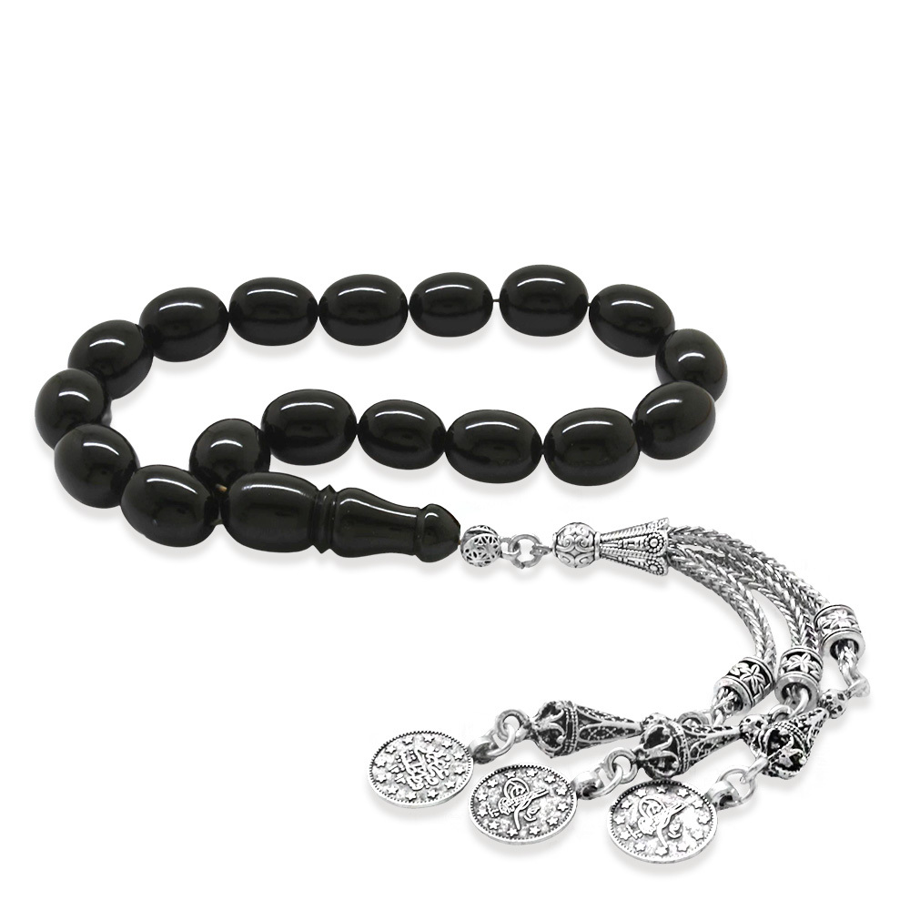 Sıkma Kehribar Efe Tesbih - 3 lü Kamçı Kararmaz Metal Püsküllü - Siyah Renk - Özel Kesim