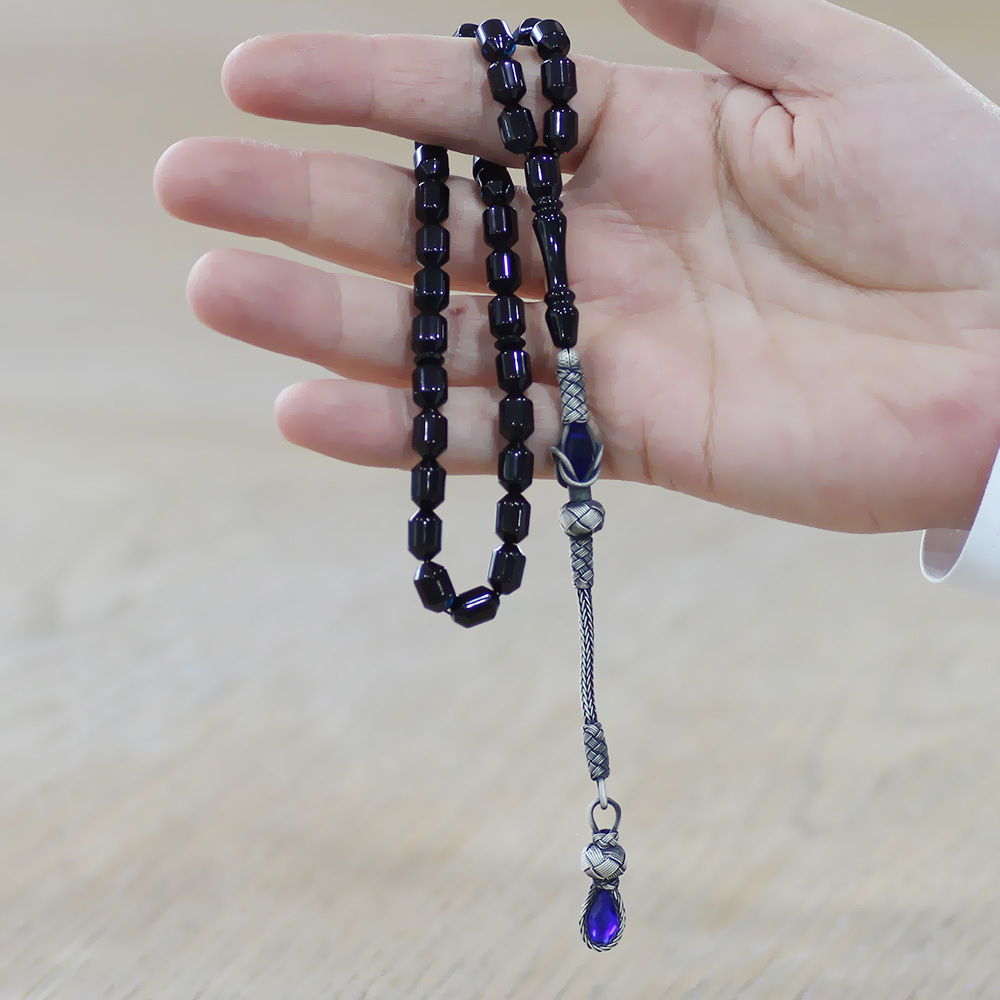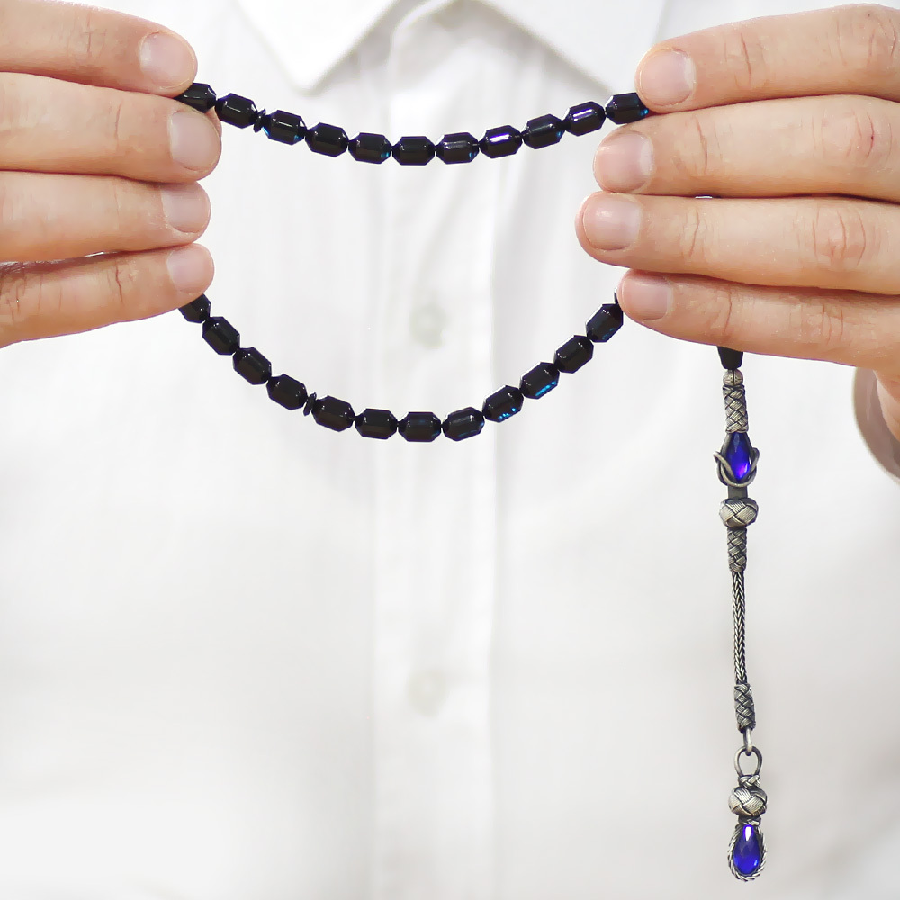 Sıkma Kehribar Tesbih - 1000 Ayar Gümüş Kazaz Püsküllü - Mavi Siyah Renk - Kapsül Kesim