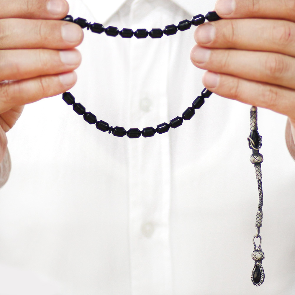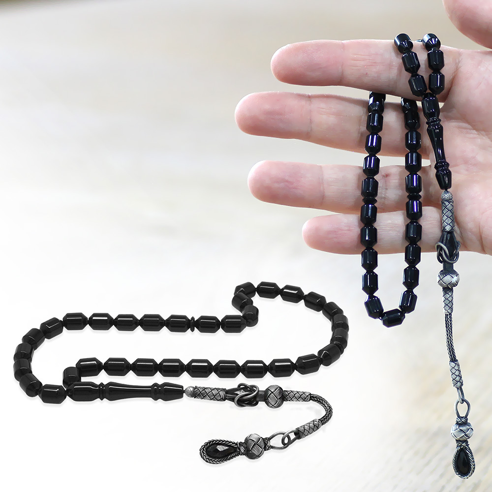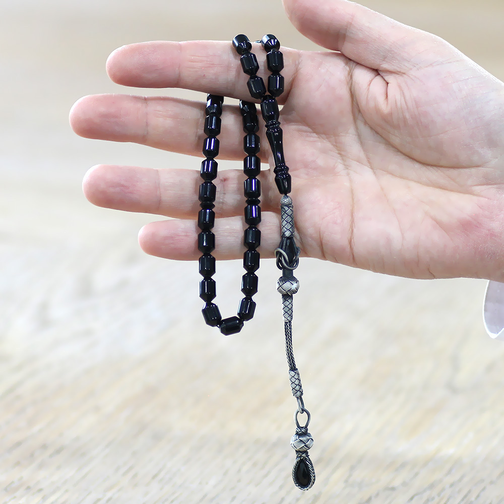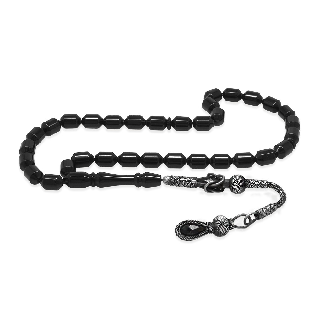 Sıkma Kehribar Tesbih - 1000 Ayar Gümüş Kazaz Püsküllü - Siyah Renk - Kapsül Kesim