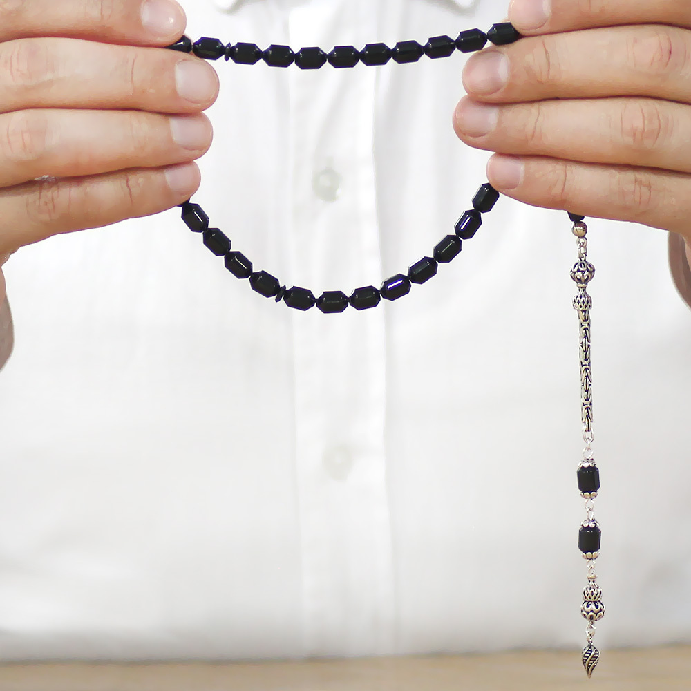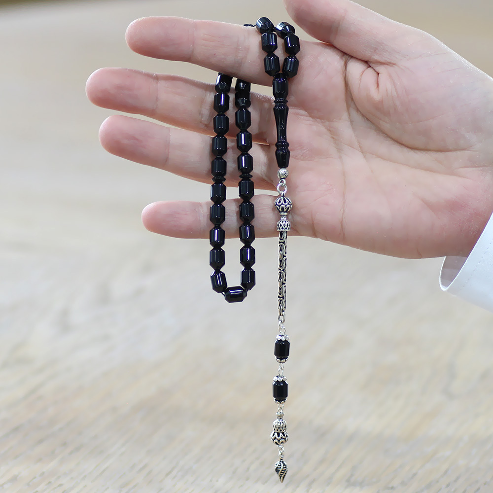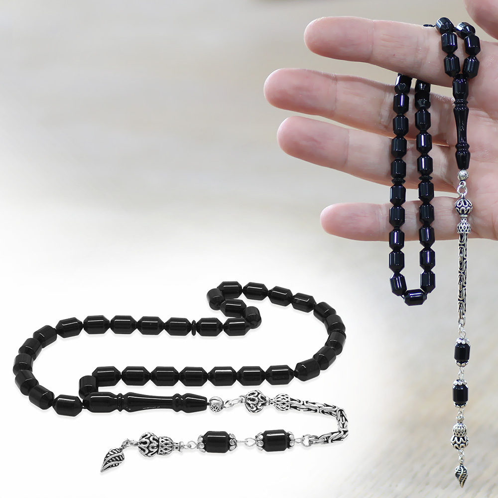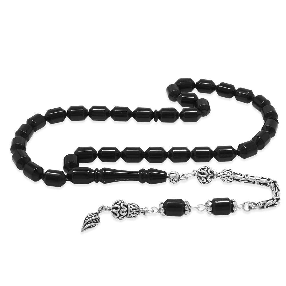Sıkma Kehribar Tesbih - 925 Ayar Gümüş Kral Püsküllü - Siyah Renk - Kapsül Kesim