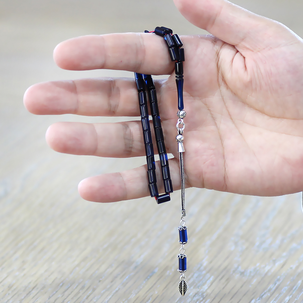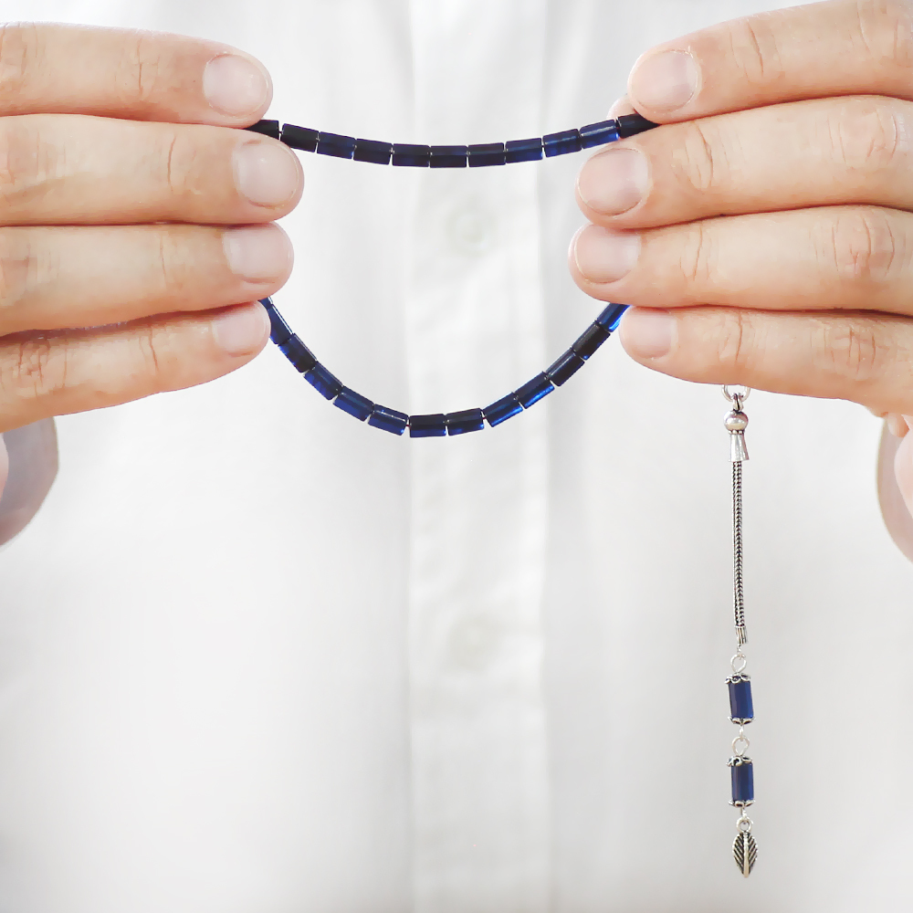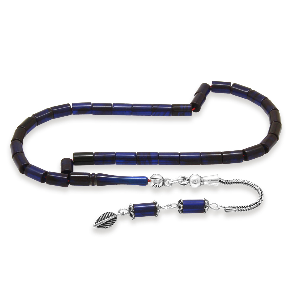 Sıkma Kehribar Tesbih - 925 Ayar Gümüş Püsküllü - Bilek Boy - Mavi Siyah Renk - Kesme Kesim