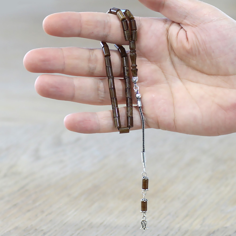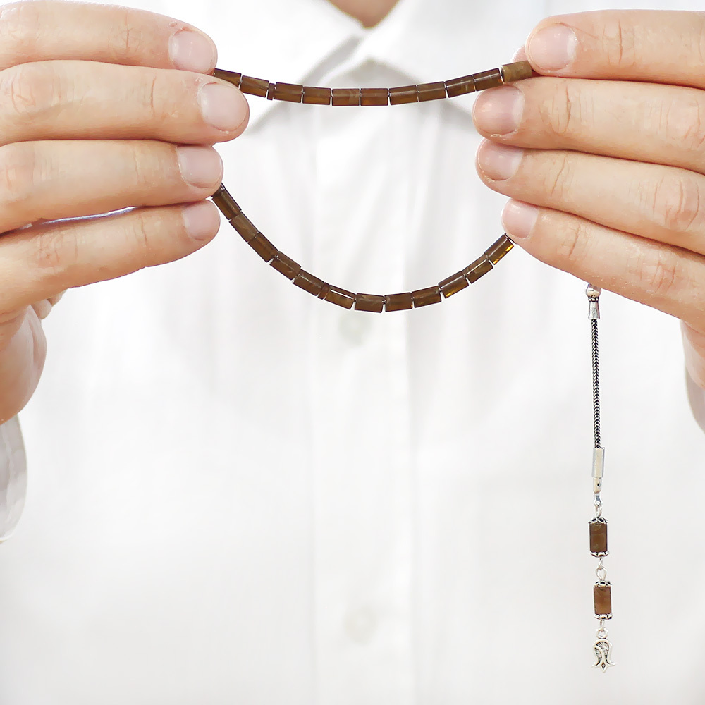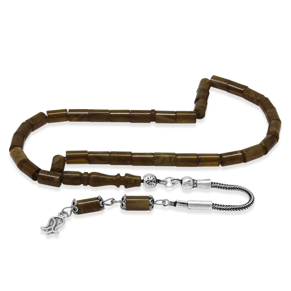 Sıkma Kehribar Tesbih - 925 Ayar Gümüş Püsküllü - Mini Boy - Kahverengi Beyaz - Kesme Kesim