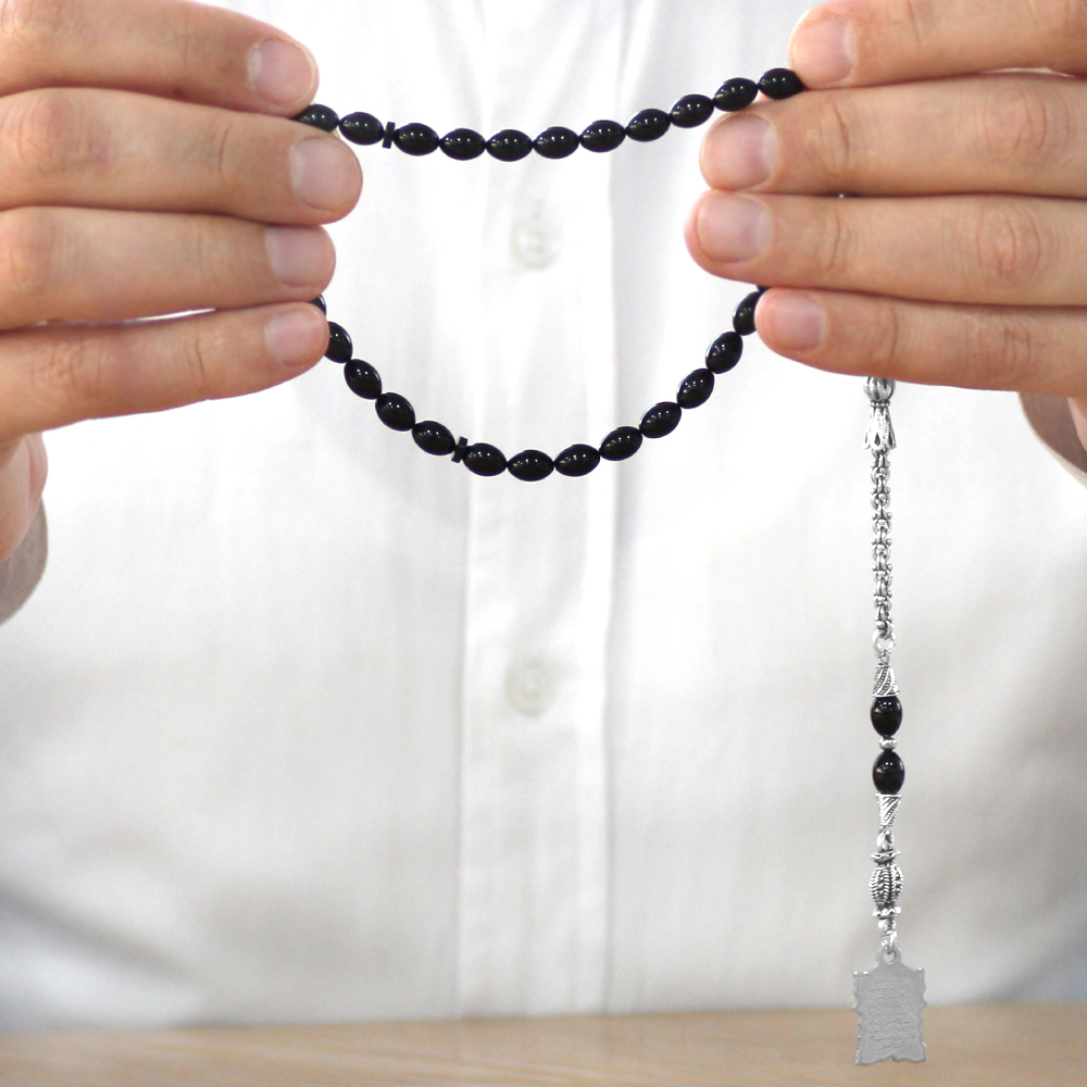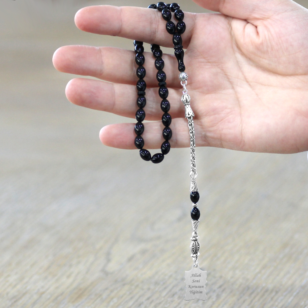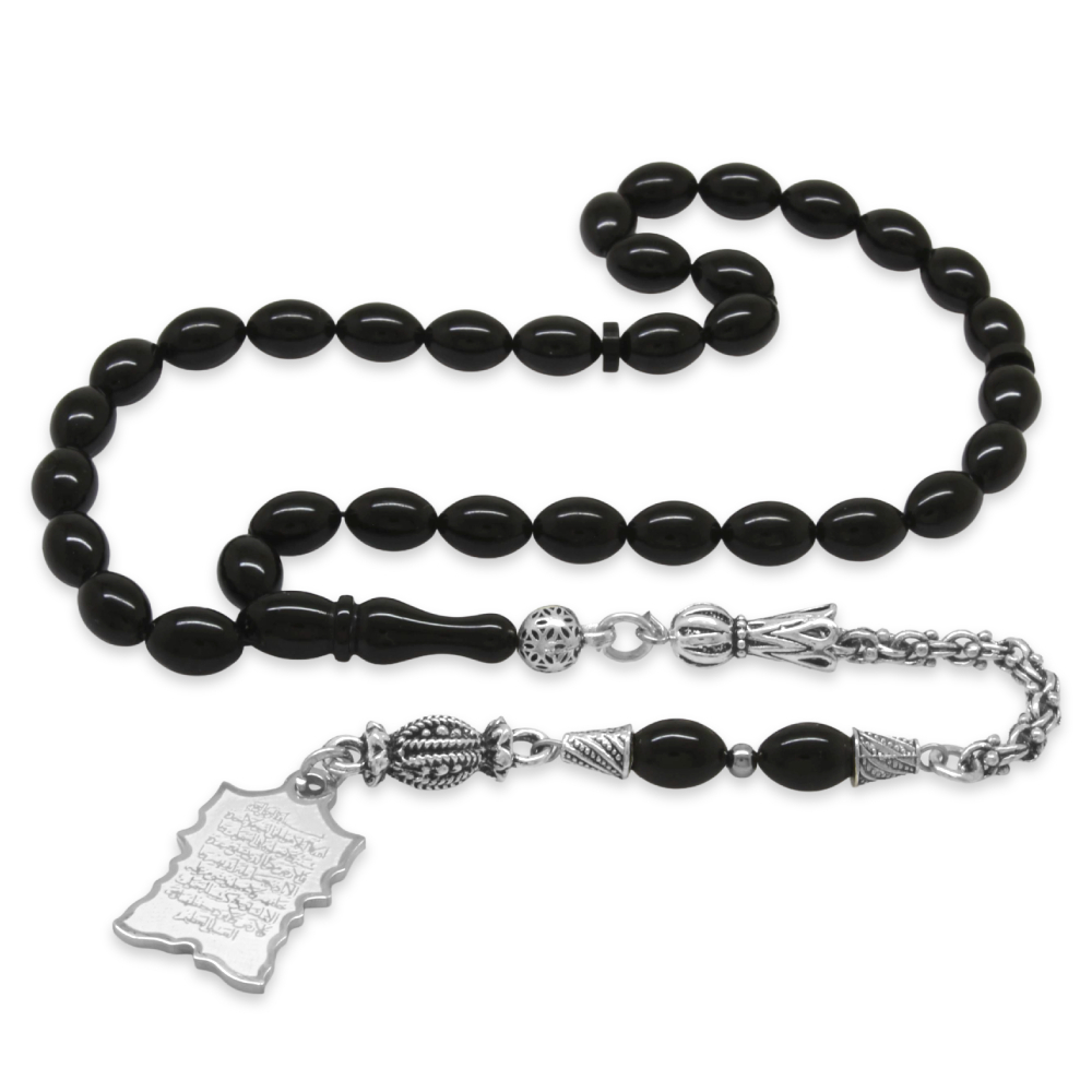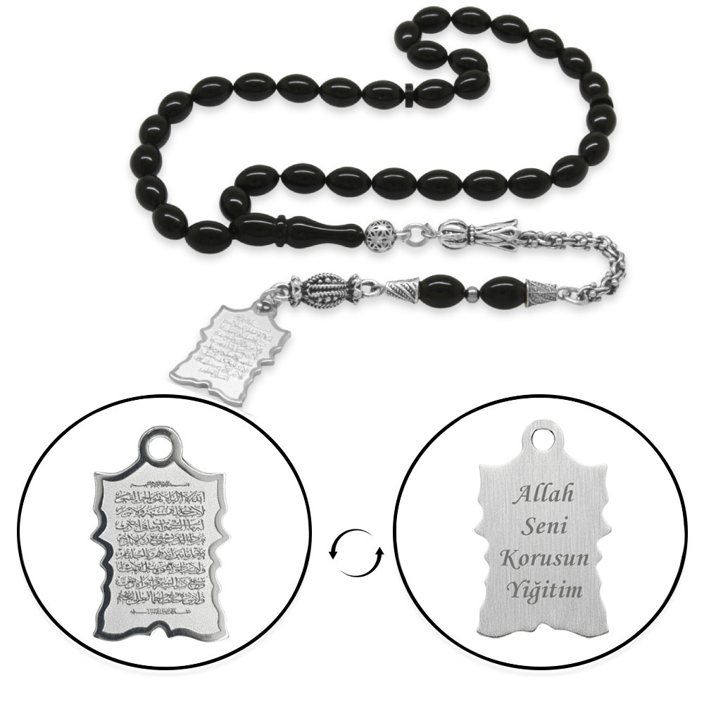 Sıkma Kehribar Tesbih - Metal Püsküllü - Siyah - Ayetel Kürsi Uçlu İsme Özel Yazılı - Arpa Kesim