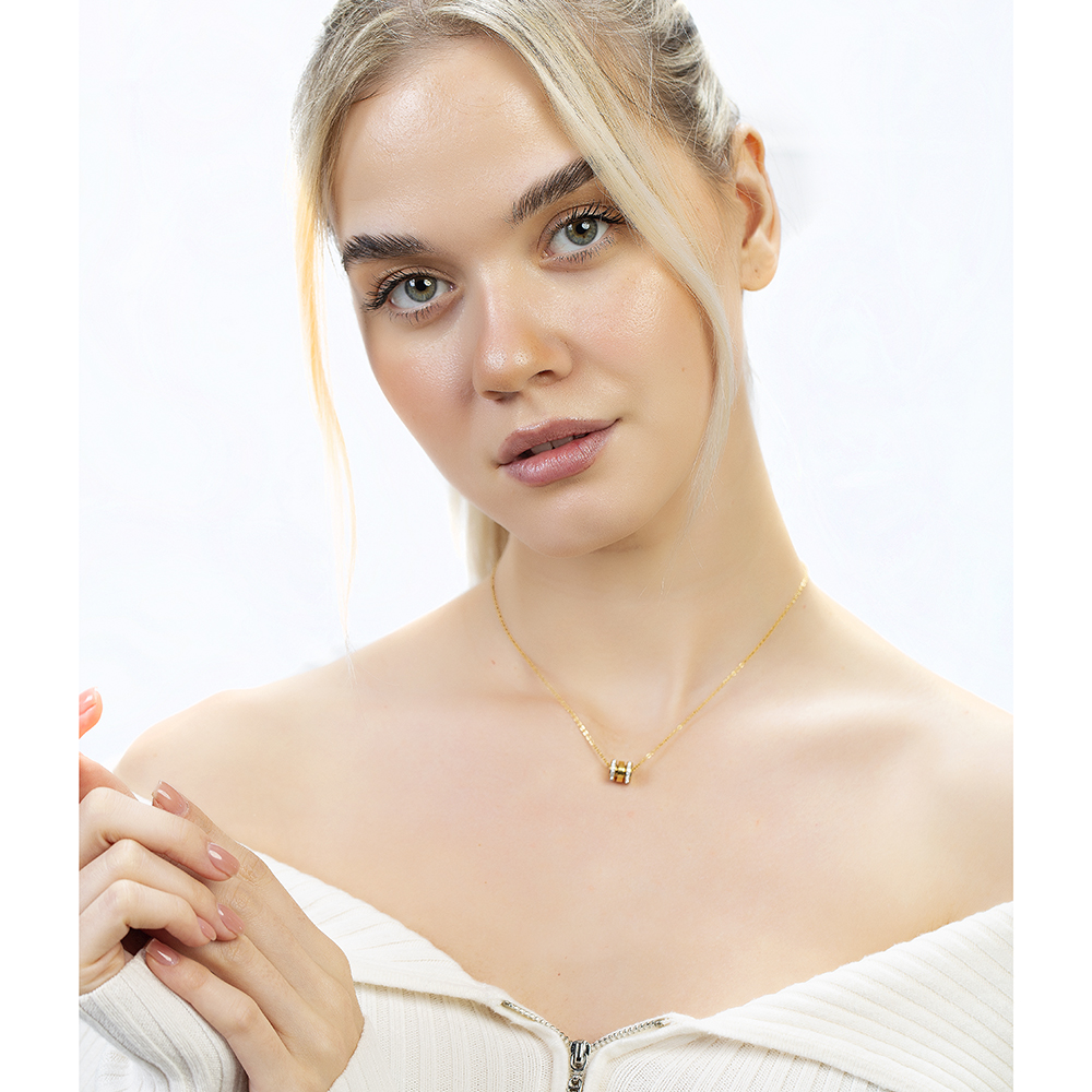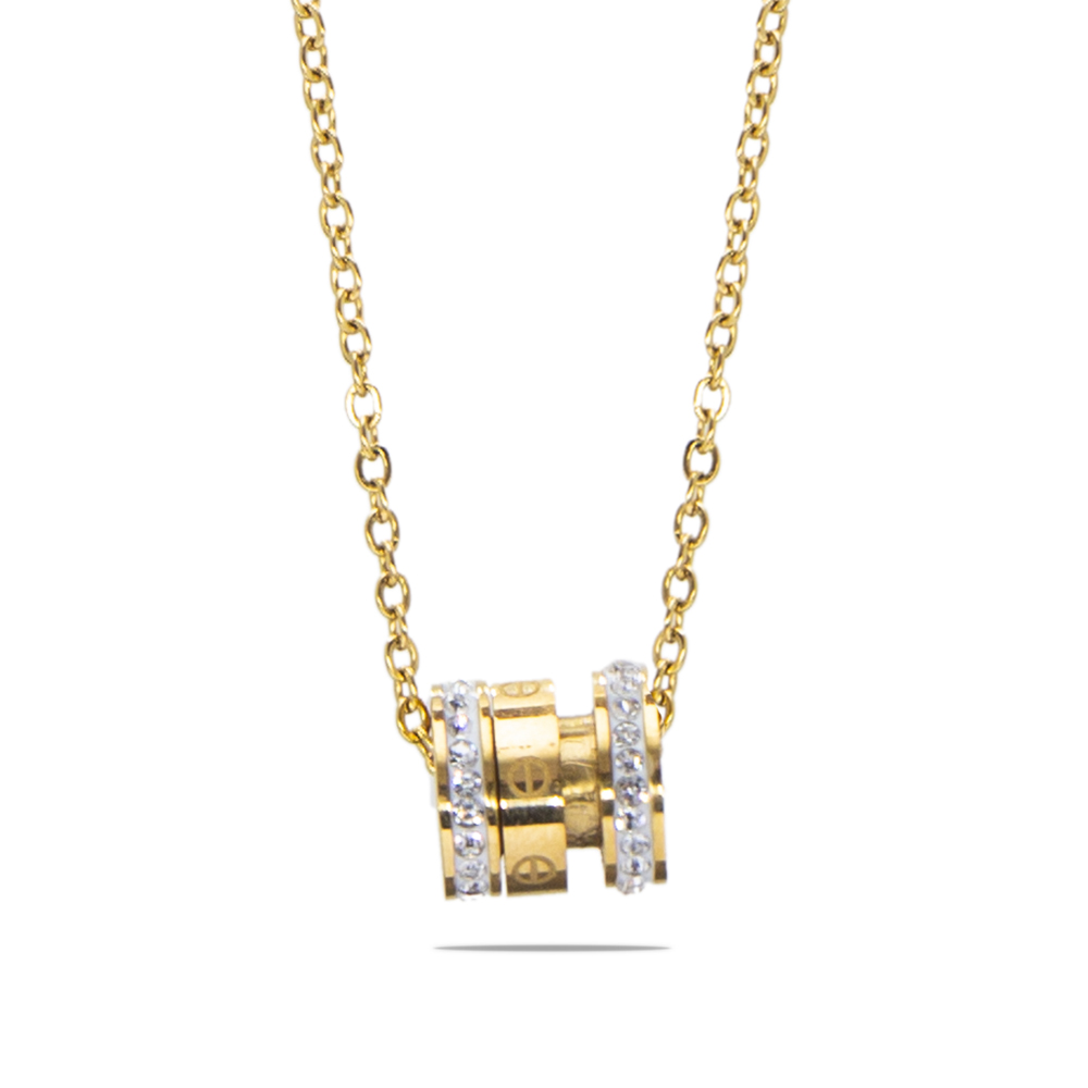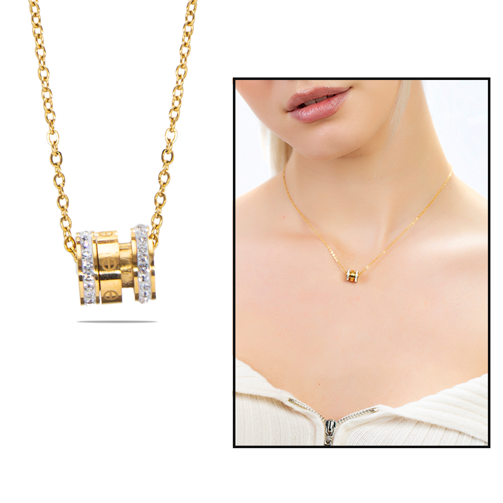 Silindir Tasarım Kenarları Zirkon Taşlı Altın Renk Çelik Kadın Kolye - 1