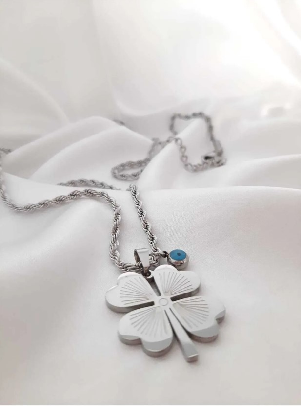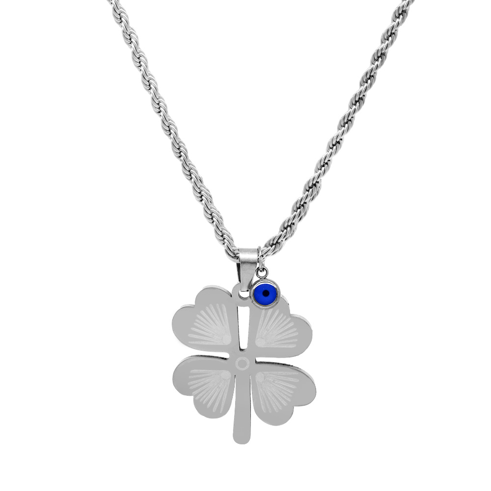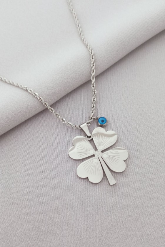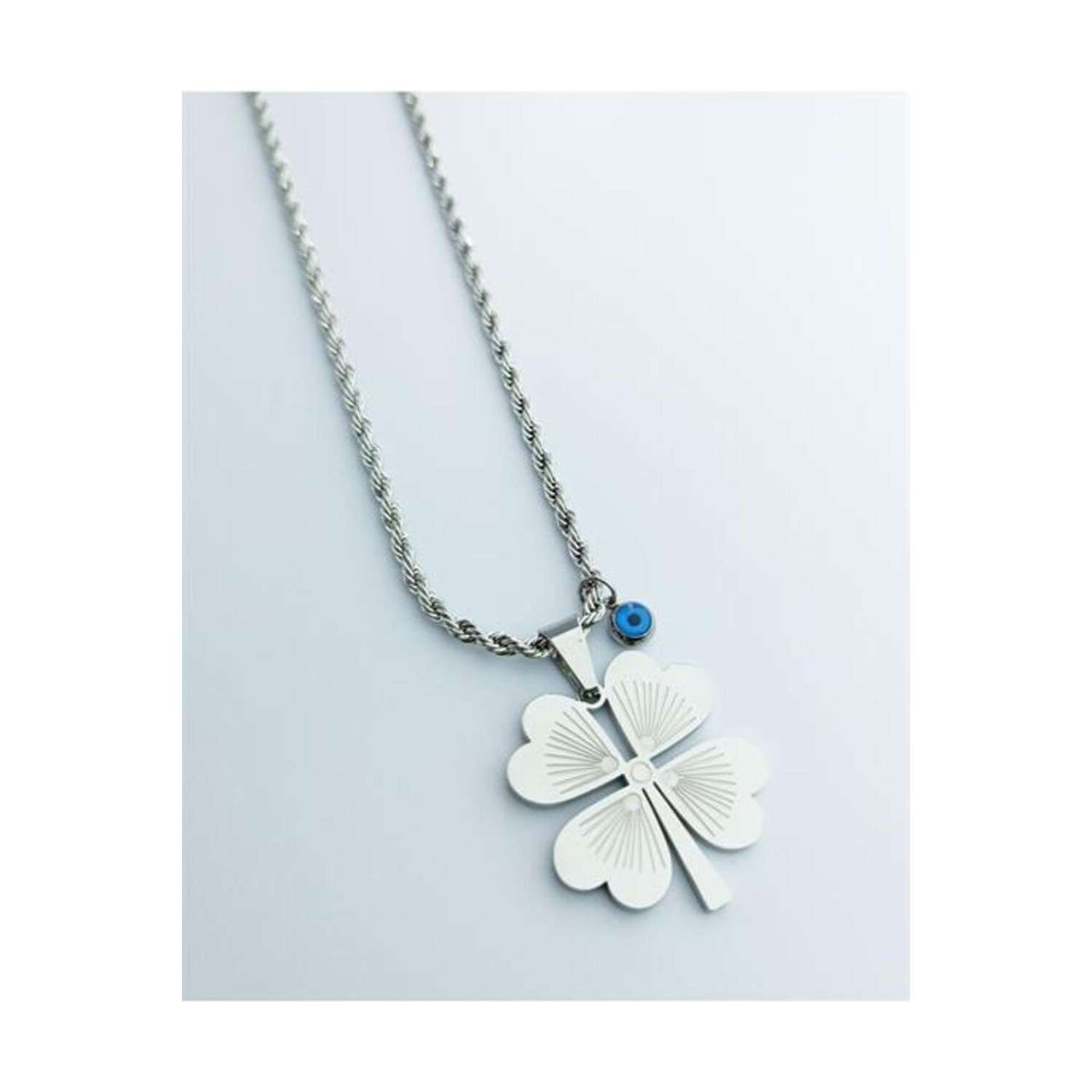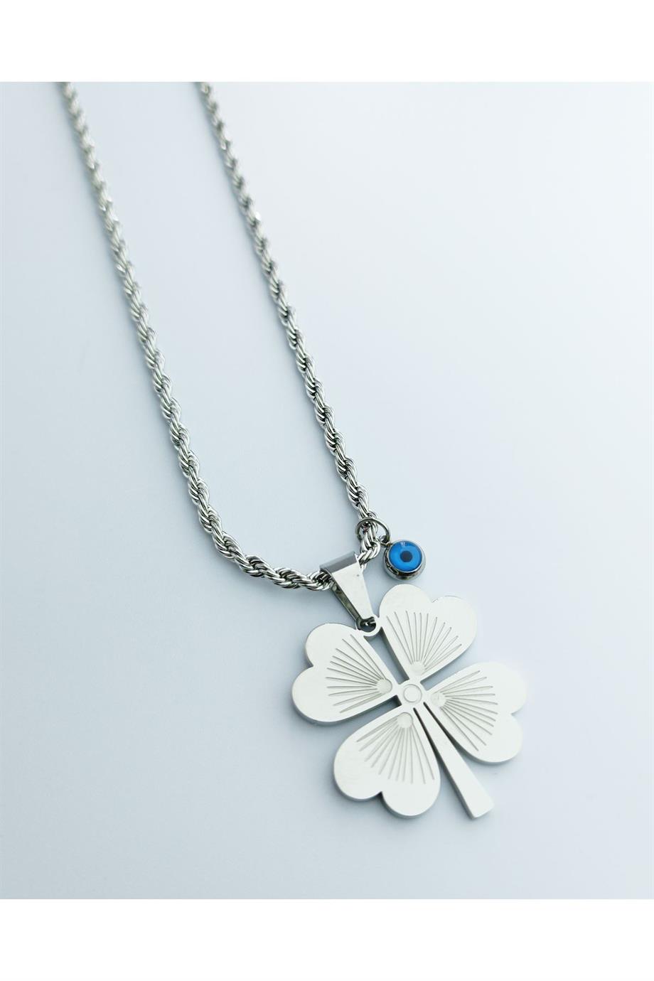Gümüş Renk Burma Zincirli Nazar Boncuğu Detaylı Yonca Yaprağı Tasarım Çelik Kadın Kolye