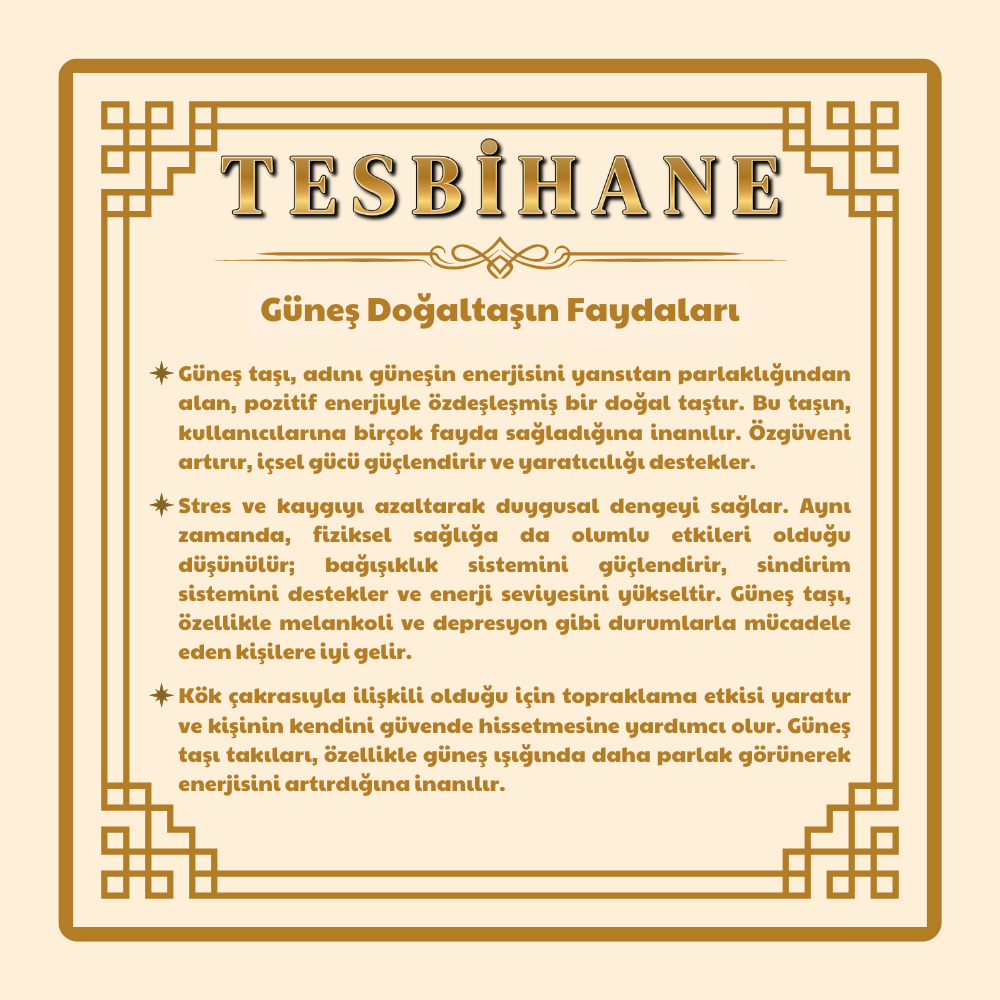 Güneş taşı, enerjik yapısıyla canlılık ve motivasyon kaynağı olarak bilinir. İçsel gücü harekete geçirerek kişinin kendine güvenini artırır ve özgüven duygusunu güçlendirir. Pozitif enerjisiyle karamsarlığı dağıtır, neşeyi ve yaşam sevincini yükseltir. Zihinsel berraklık sağlar ve karar verme süreçlerinde netlik kazandırır. Ruhsal olarak kişiyi destekleyerek iç dengeyi korumaya yardımcı olur. Duygusal takıntılardan kurtulmayı kolaylaştırır, başarı isteğini güçlendirir. Enerjisiyle vücuda canlılık verir, genel rahatlama hissi sağlar. Güneş taşının canlandırıcı ve motive edici yapısı, kişinin yaşamına sıcaklık ve pozitif bir enerji katar.