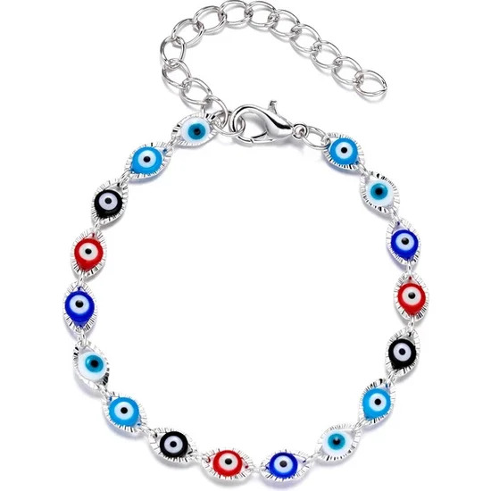 Gümüş Renk Metal Zincirli Çok Renkli Mineli Nazar Boncuğu Detaylı Göz Tasarım Kadın Bileklik