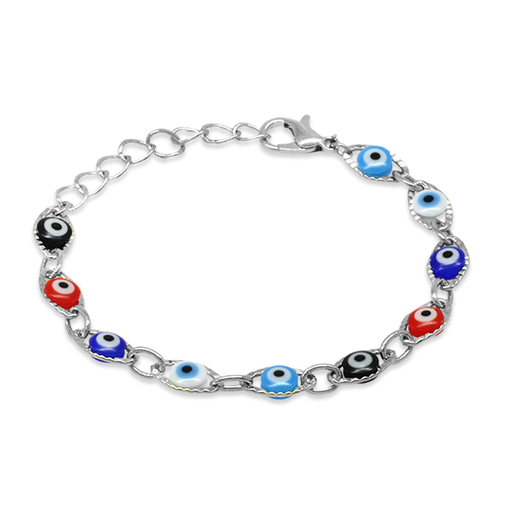 Gümüş Renk Metal Zincirli Çok Renkli Mineli Nazar Boncuğu Detaylı Göz Tasarım Kadın Bileklik - 1