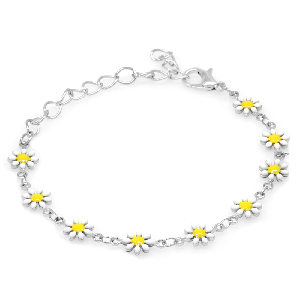 Gümüş Renk Metal Zincirli Sarı Beyaz Mineli Kır Çiçeği Detaylı Kadın Bileklik