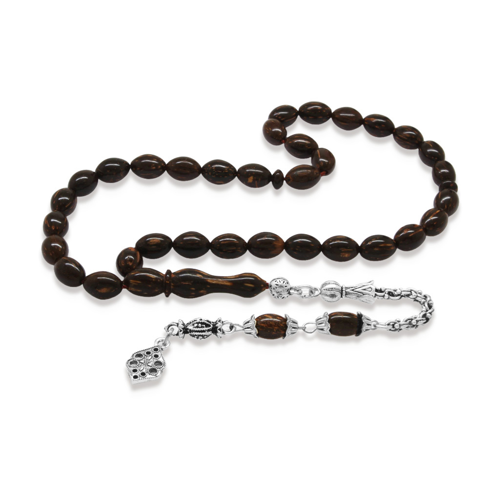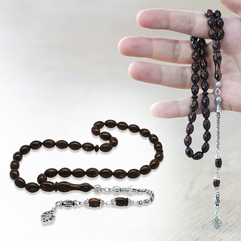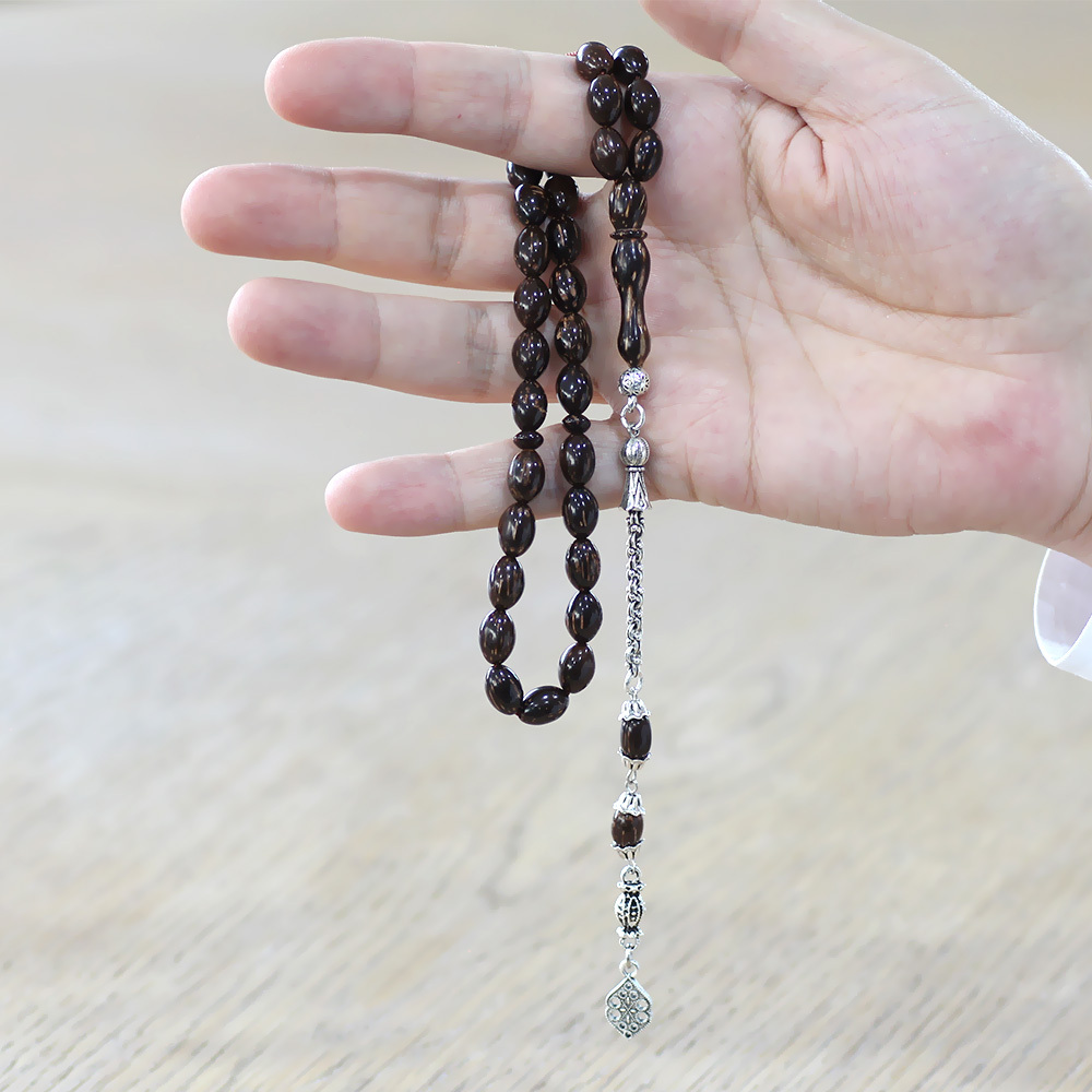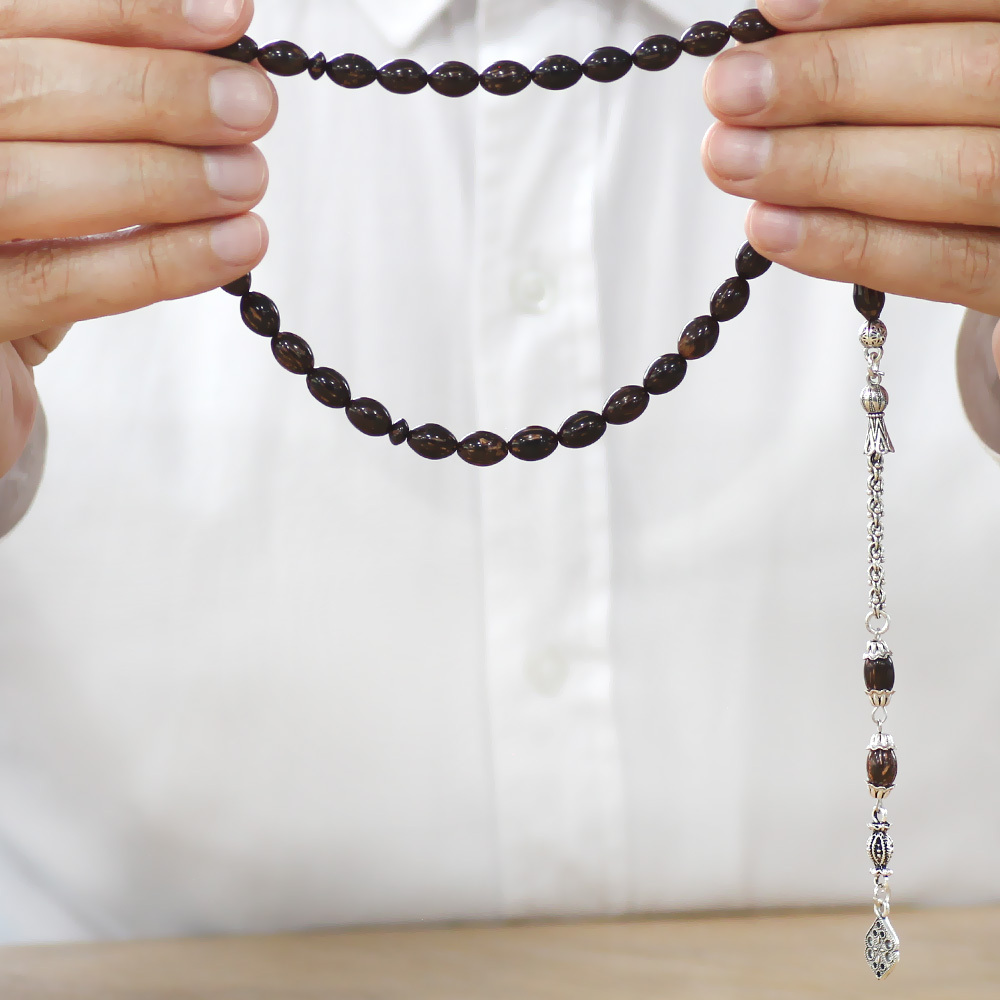 Sırçalı Kuka Tesbih - Kararmaz Metal Arnavut Zincir Püsküllü - Koyu Kahverengi - Arpa Kesim