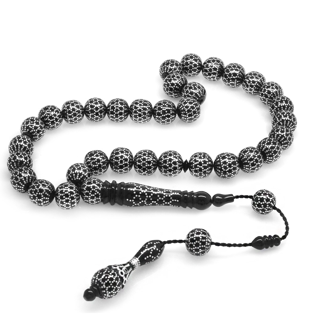 Hitamesi Nakkaşiyeli Kumpas İşçilikli Yoğun Gümüş İşlemeli Küre Kesim Erzurum Oltu Taşı Tesbih