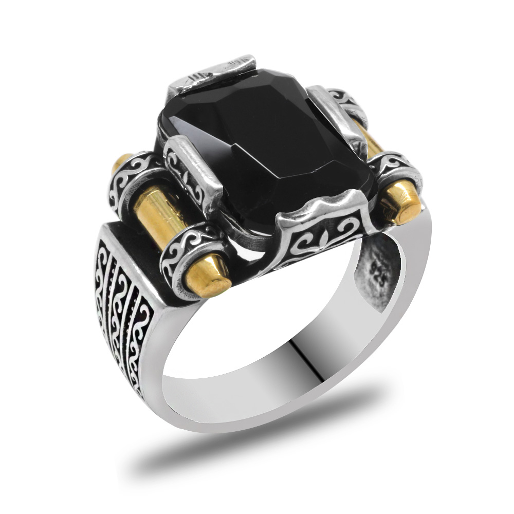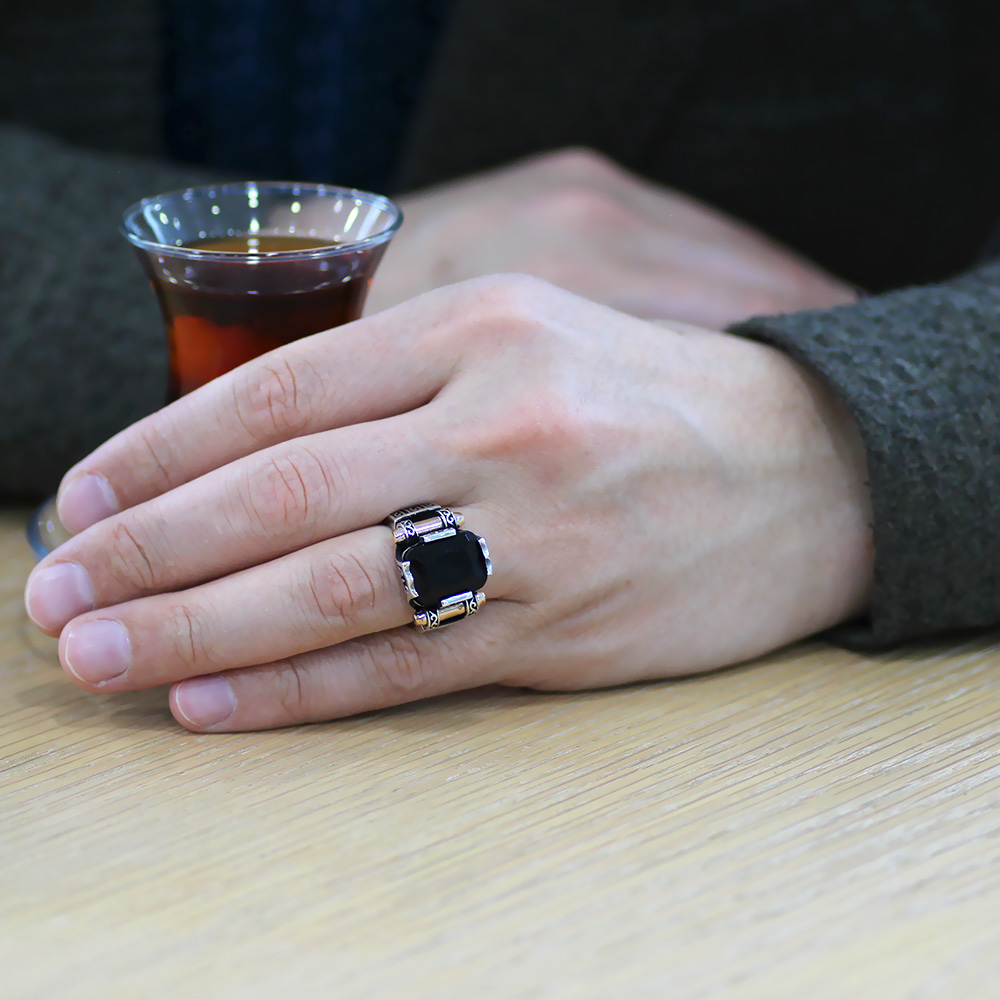Siyah Baget Taşlı Avangarde Tasarım 925 Ayar Gümüş Şah Cihan Yüzük