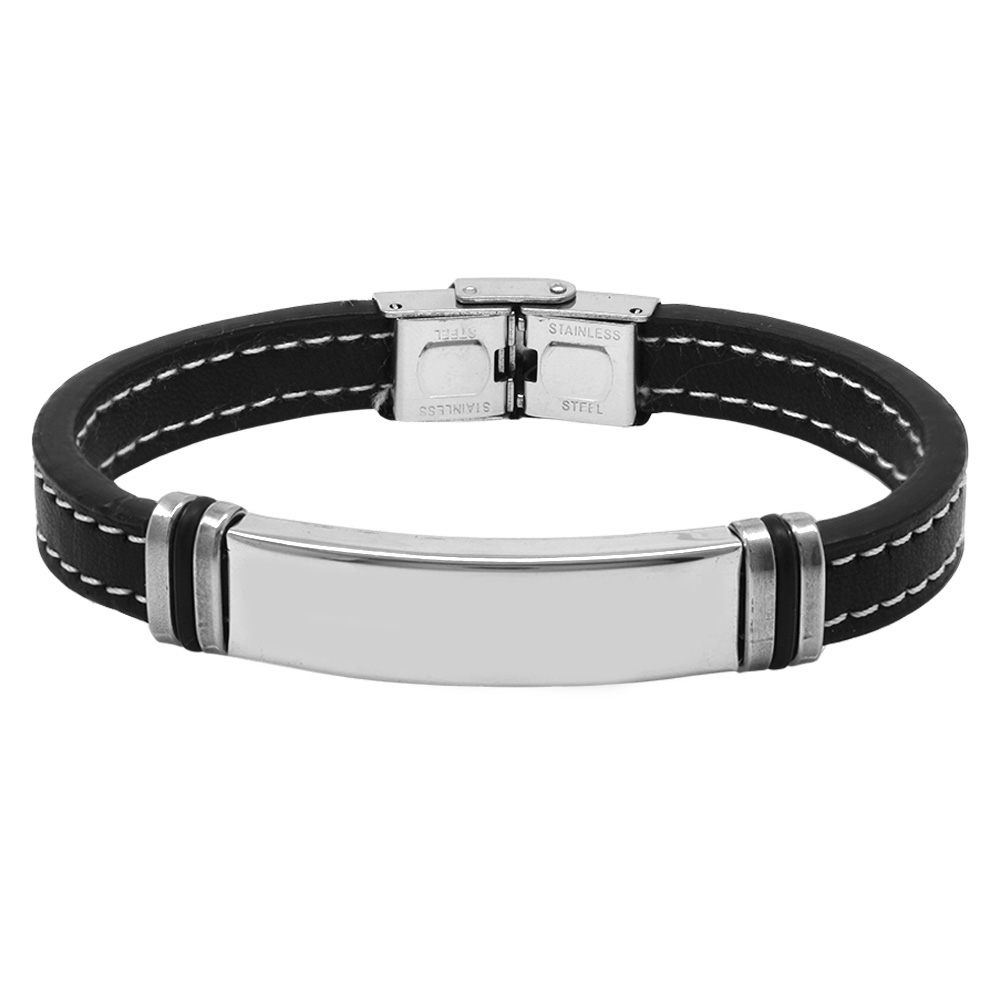 Siyah Deri ve Çelik Bileşim Kişiye Özel İsim Veya Harf Yazılı Erkek Bileklik - 1