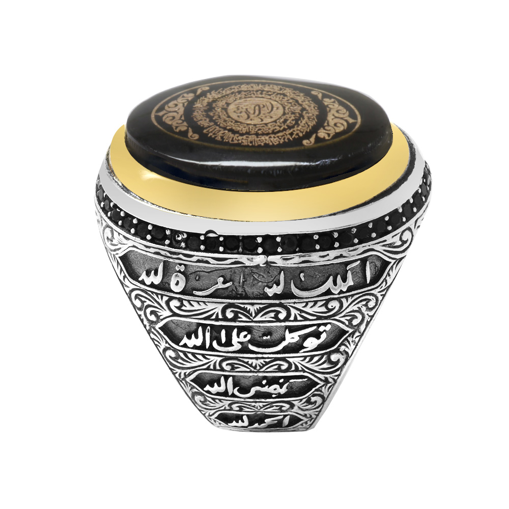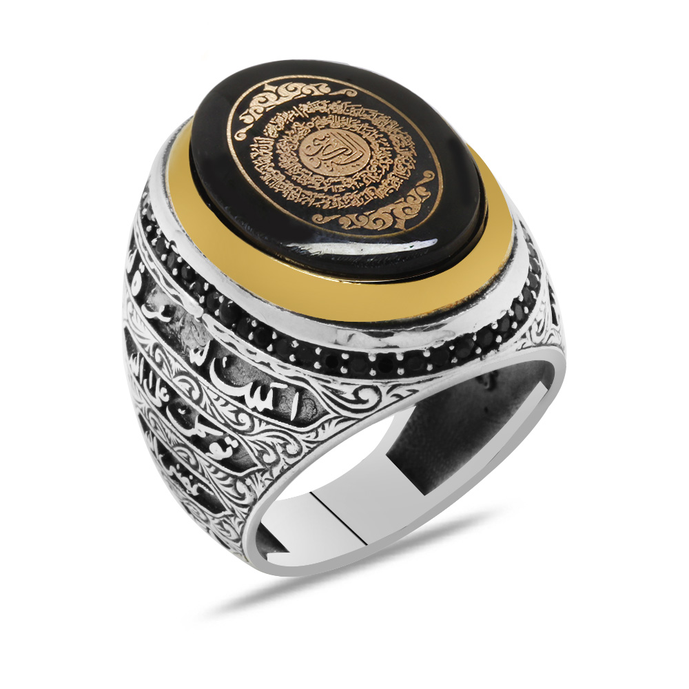 Siyah Kehribar Taş Üzerine Hüsnü Hat Ayetel Kürsi Yazılı Oval Tasarım 925 Ayar Gümüş Erkek Yüzük
