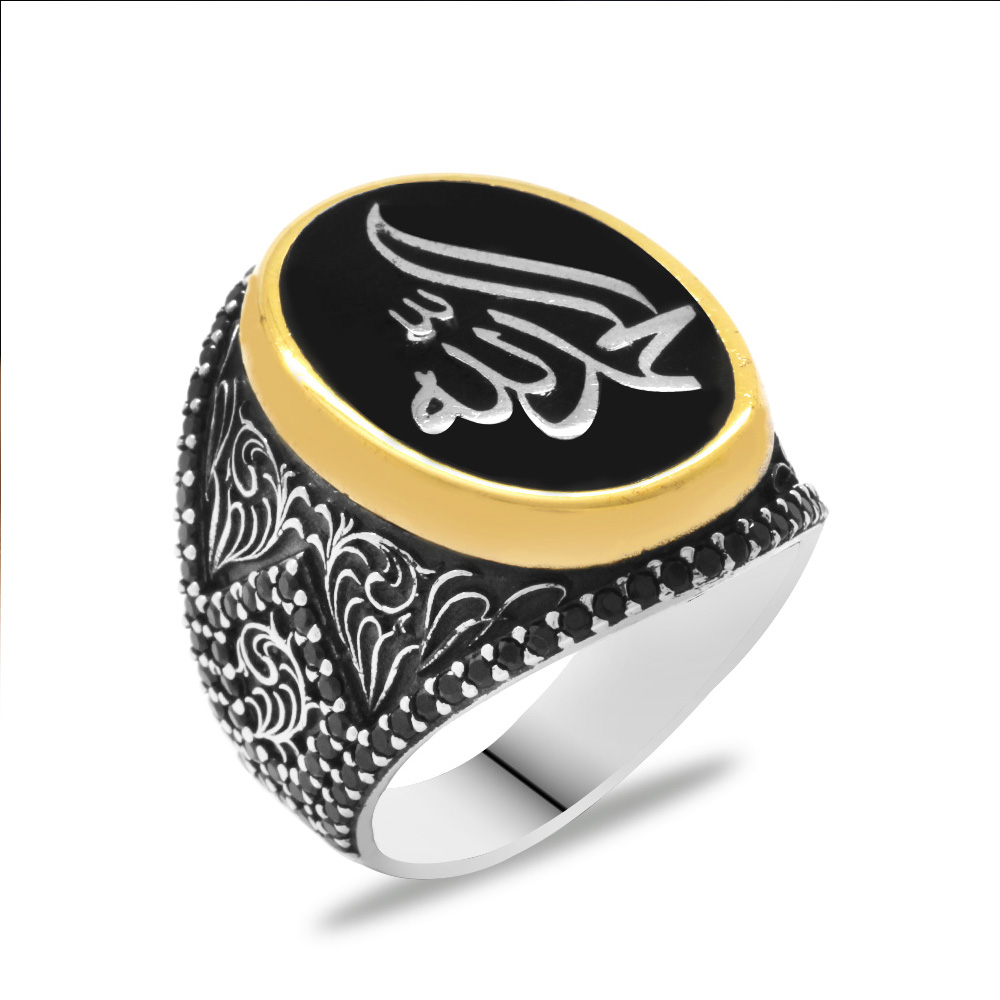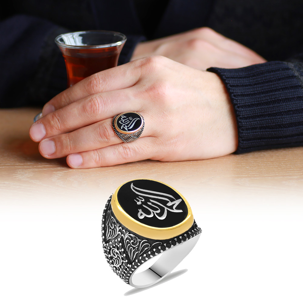 Siyah Mine İçine Elhamdülillah Yazılı Zirkon Taş Mıhlamalı 925 Ayar Gümüş Erkek Yüzük