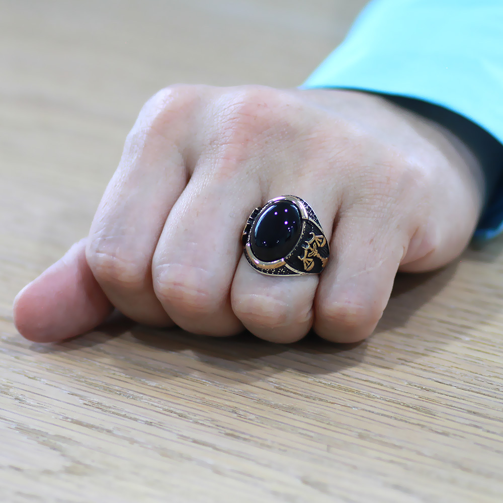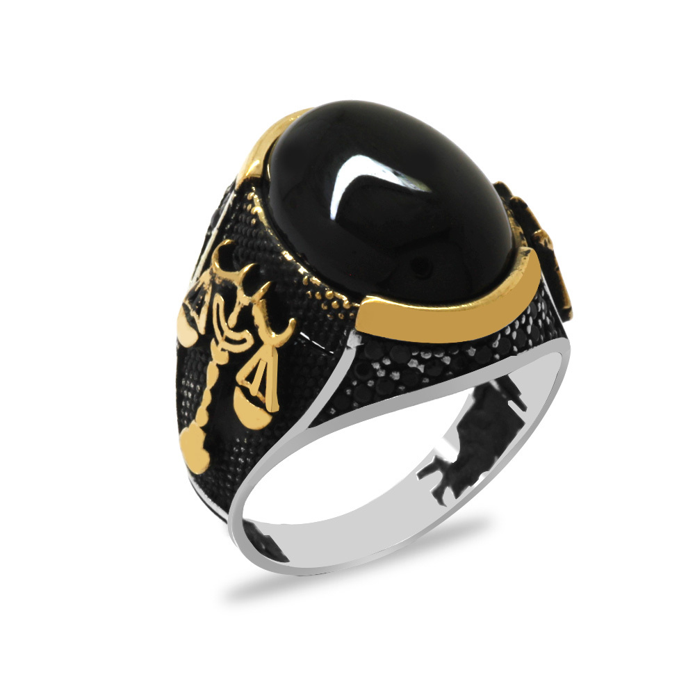 Siyah Oniks Taşlı Adalet Temalı 925 Ayar Gümüş Erkek Yüzük
