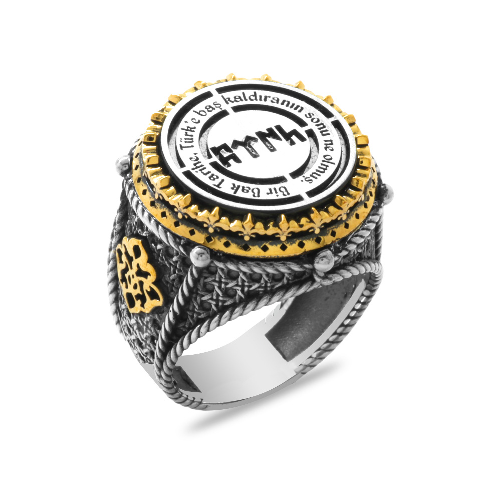 Siyah Oniks Taşlı Göktürkçe Türk Yazılı Özel Tasarım 925 Ayar Gümüş Erkek Yüzük