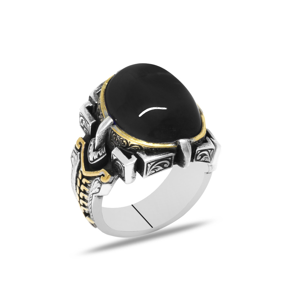 Siyah Oniks Taşlı Kalem İçilik Tasarım 925 Ayar Gümüş Erkek Yüzük