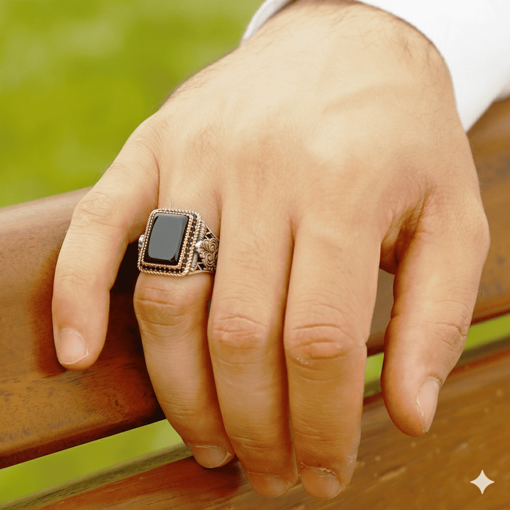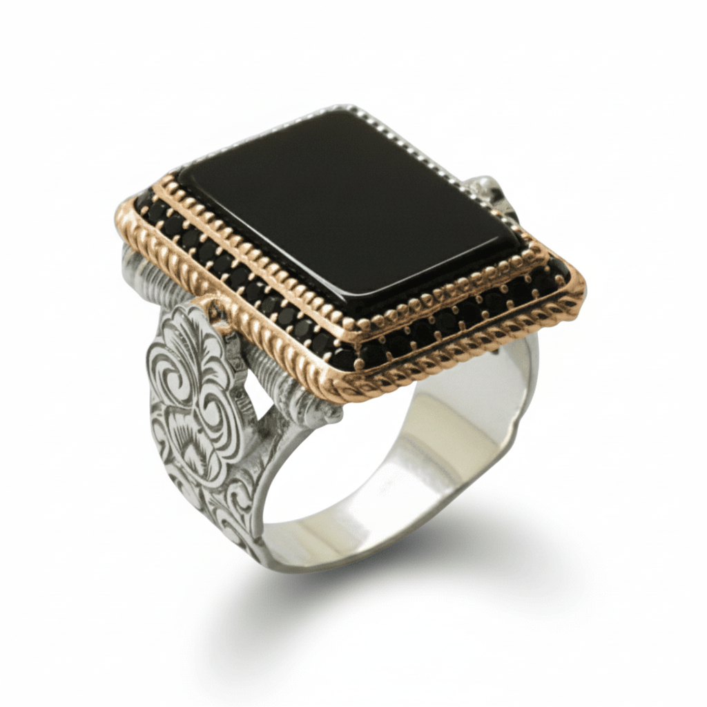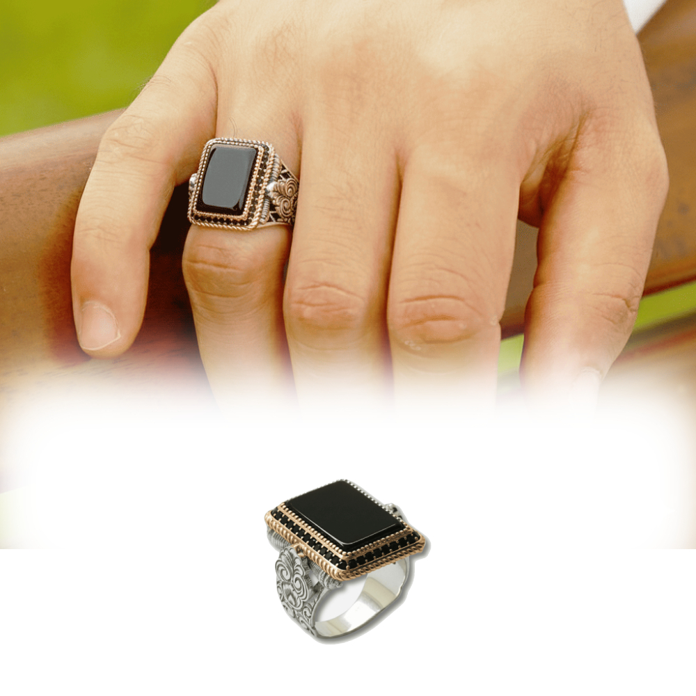 Siyah Oniks Taşlı Kalem İşçilikli Mikro Zirkon Taş Süslemeli 925 Ayar Gümüş Erkek Yüzük