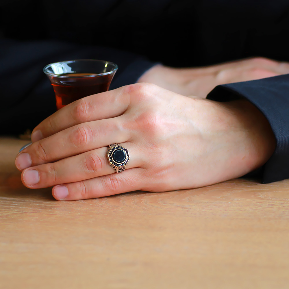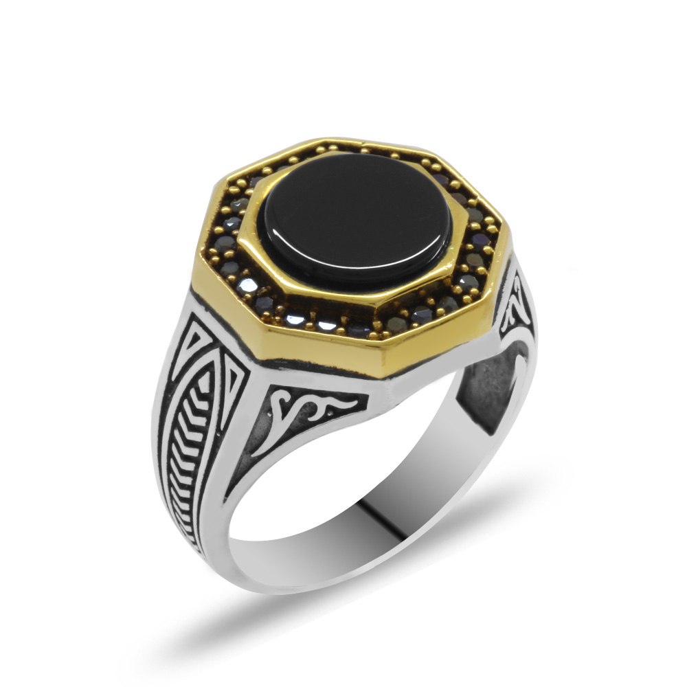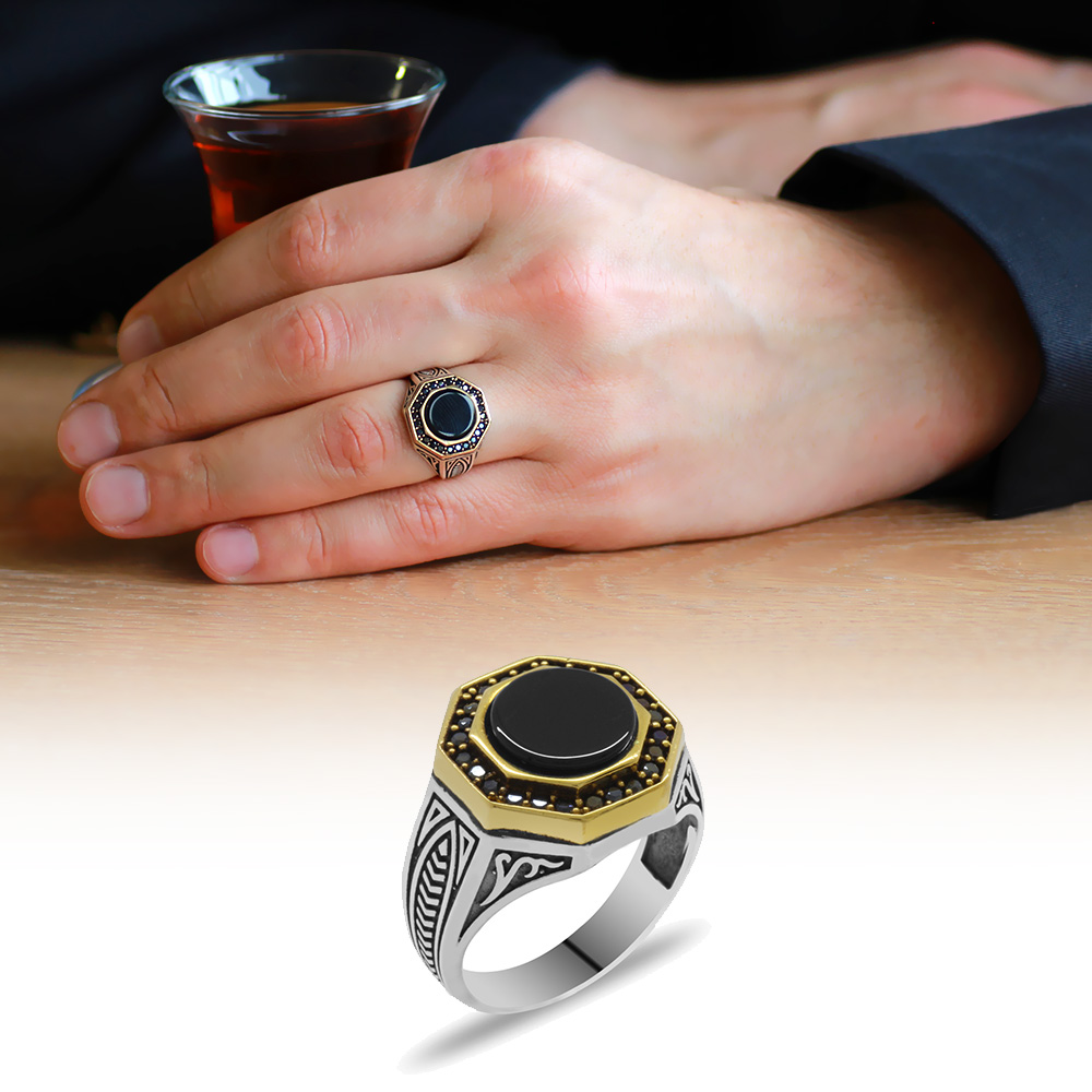 Siyah Oniks Taşlı Kenarları Mikro Taş İşlemeli 925 Ayar Gümüş Erkek Yüzük