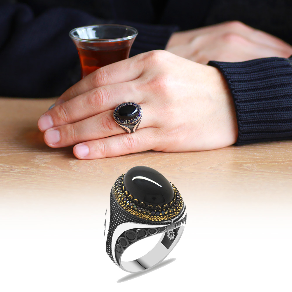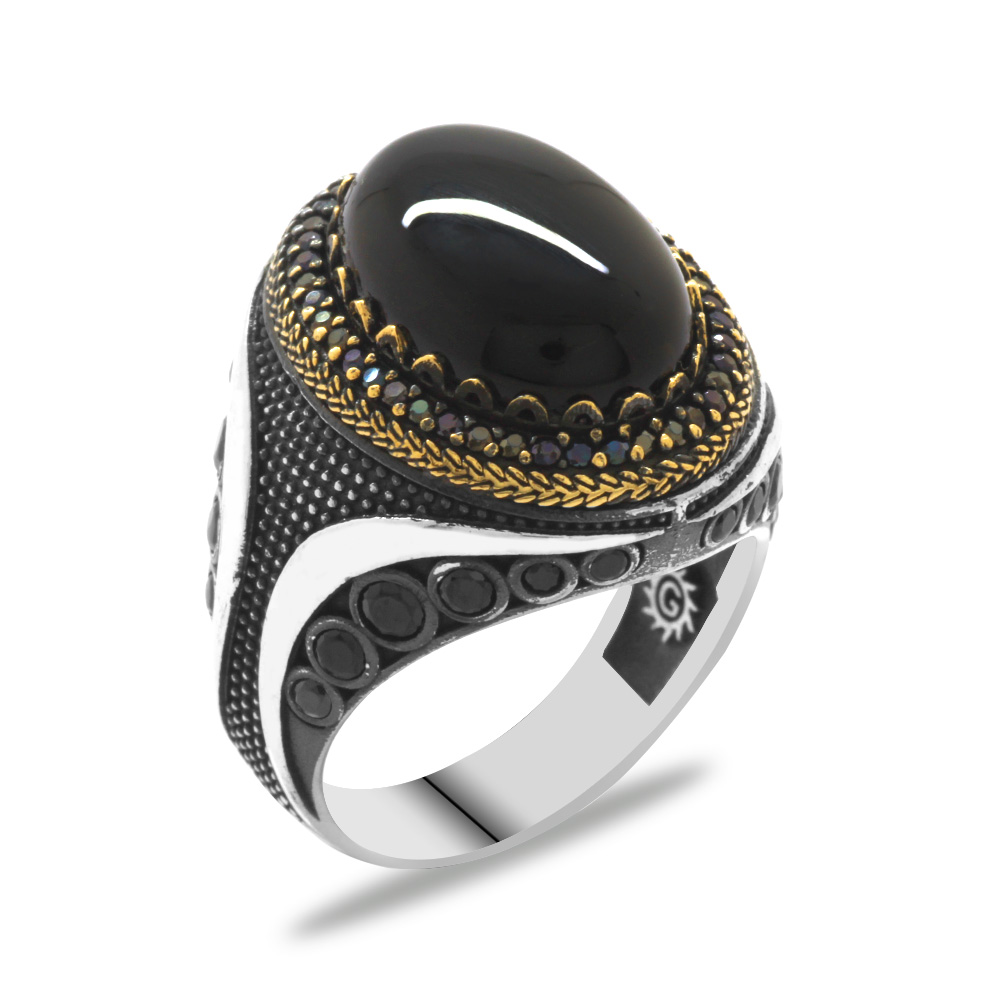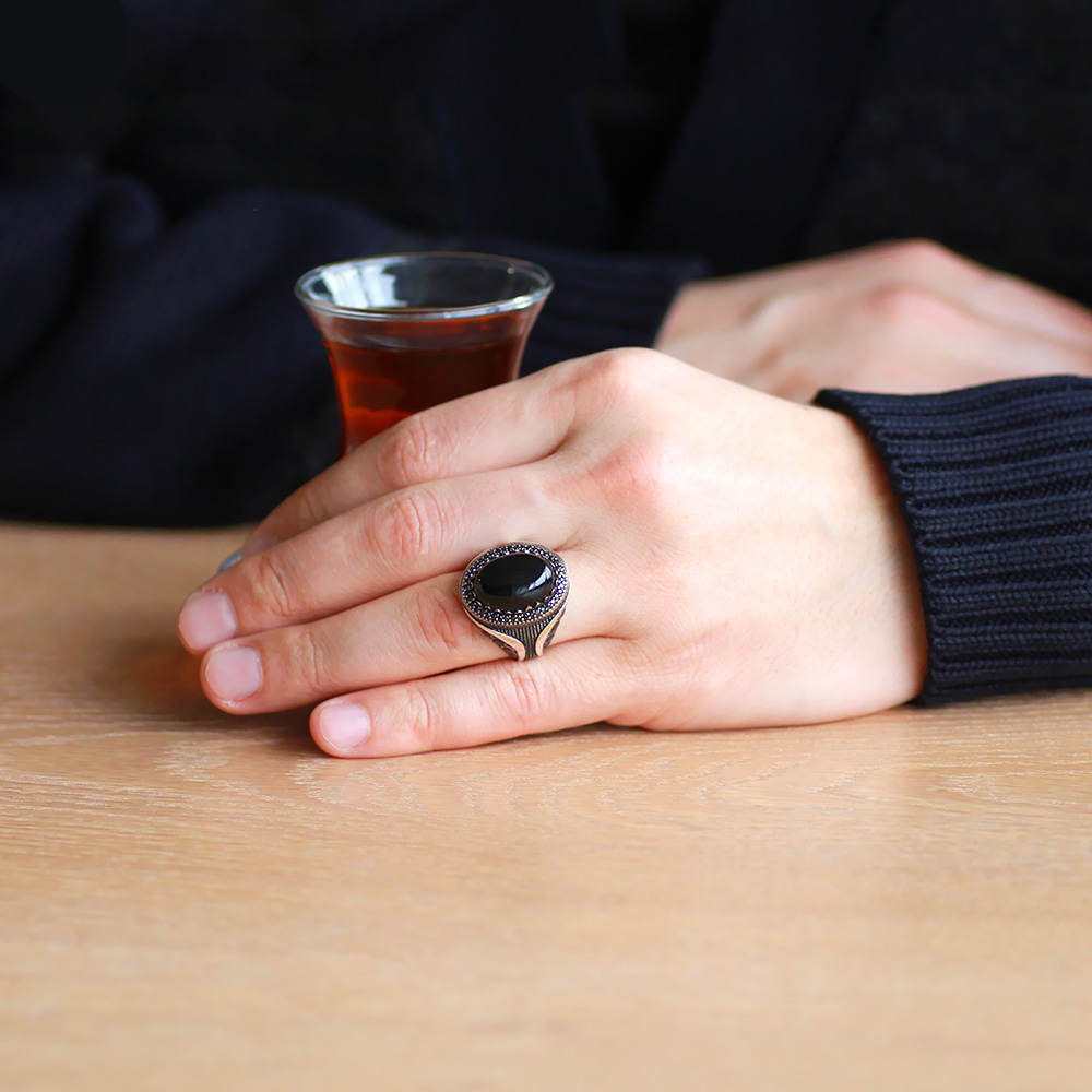 Siyah Oniks Taşlı Mikro Zirkon Taş Mıhlamalı Oval Tasarım 925 Ayar Gümüş Erkek Yüzük