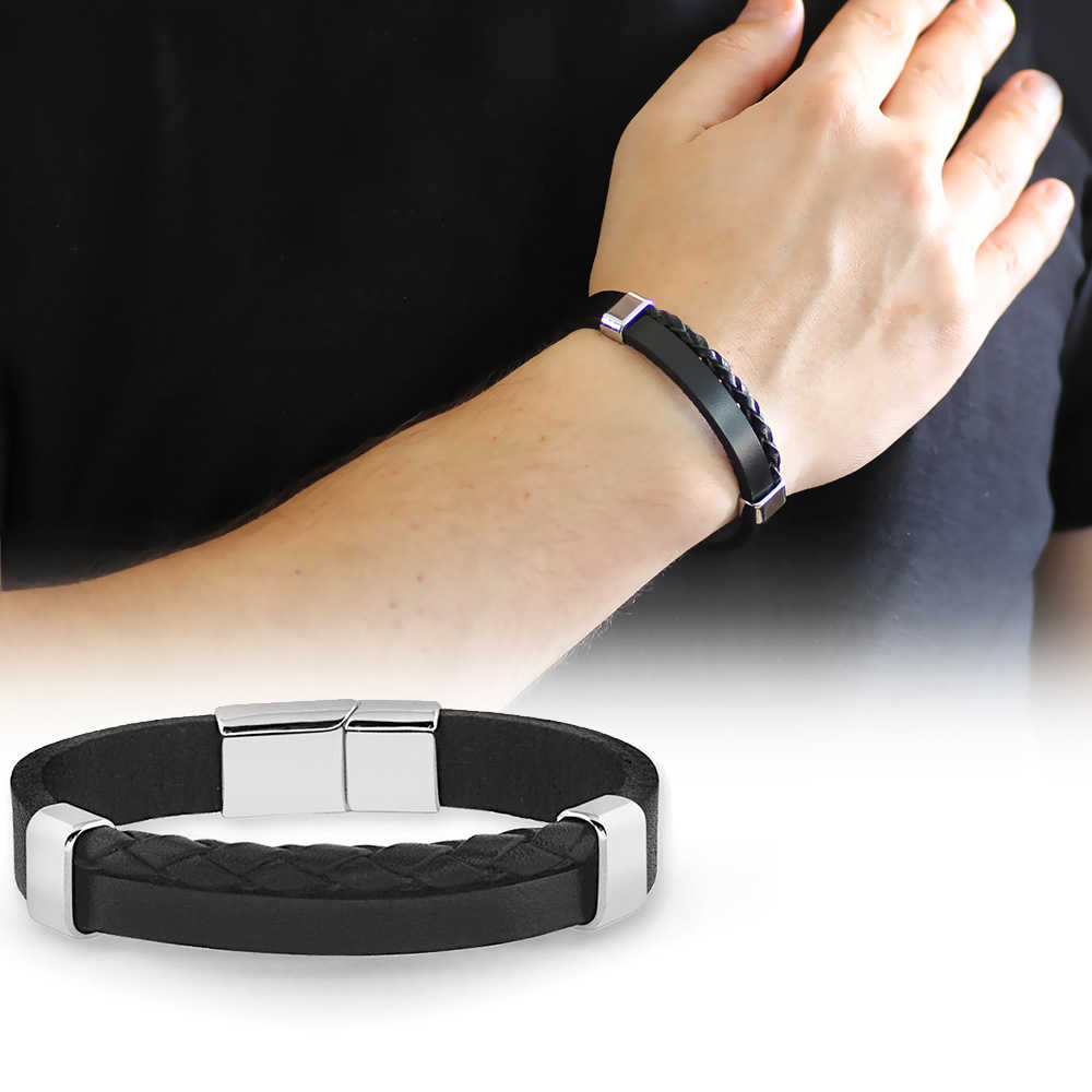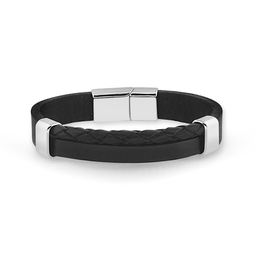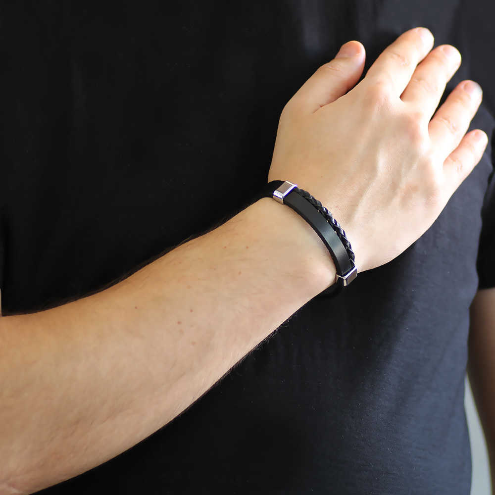 Hasır Tasarım Çift Sıra Siyah Çelik Deri Kombinli Erkek Bileklik