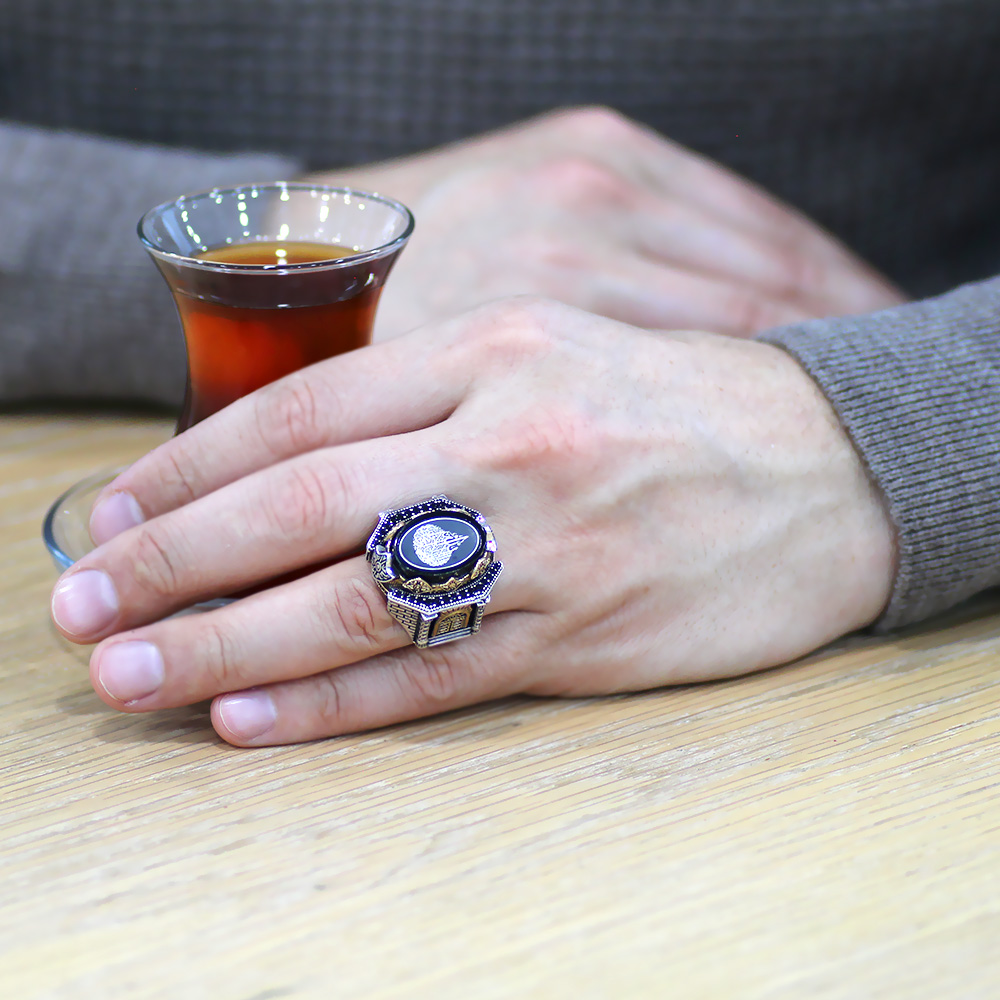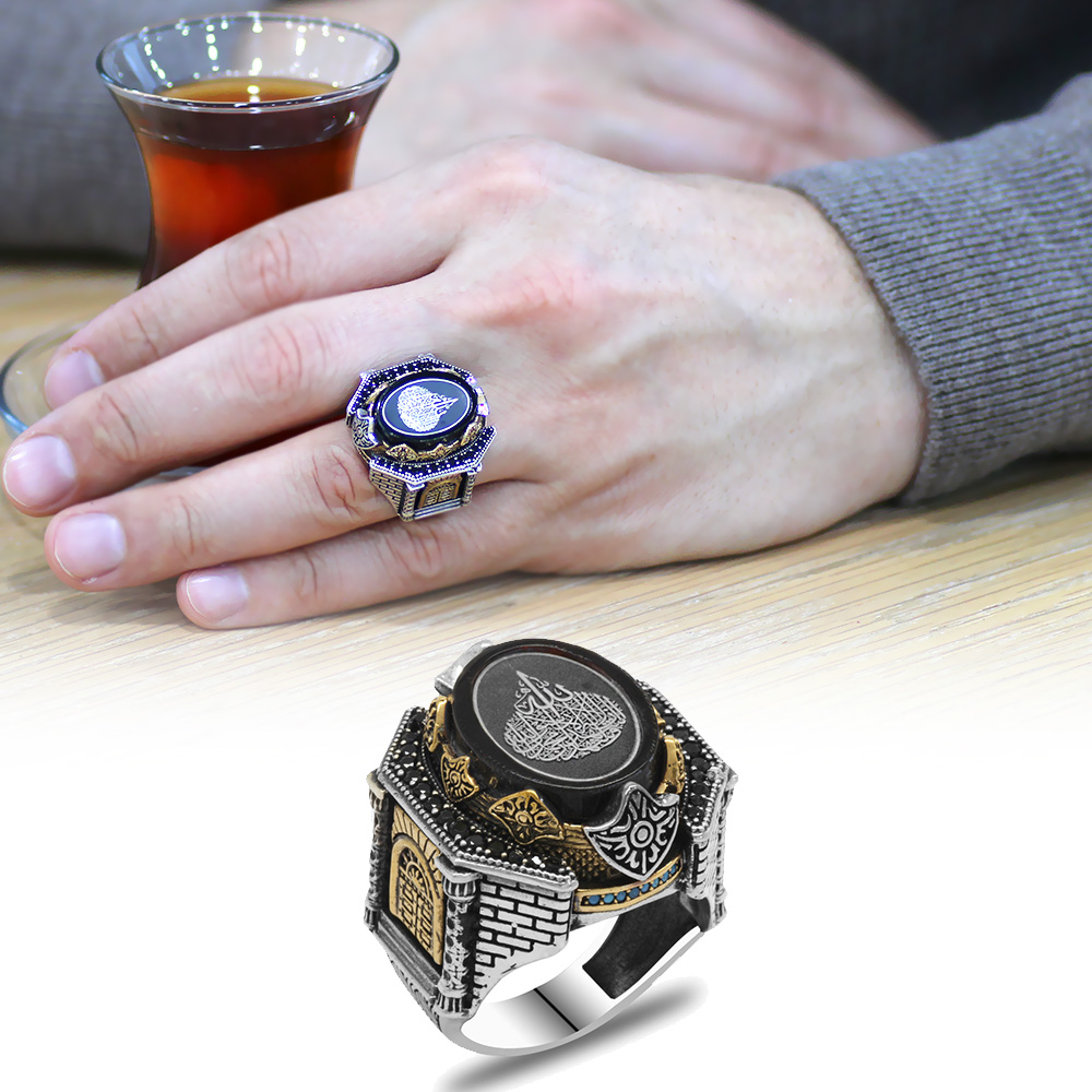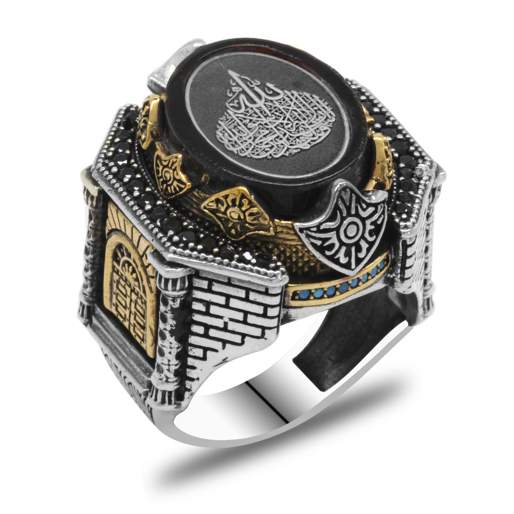 Siyah Kehribar Üzerine Hüsnü Hat Ayet El Kürsi Yazılı Kale Tasarım 925 Ayar Gümüş Erkek Yüzük