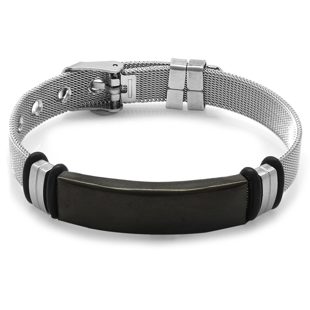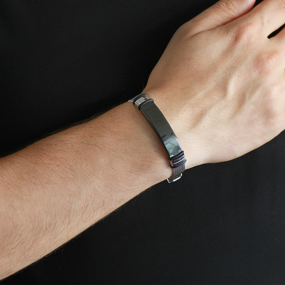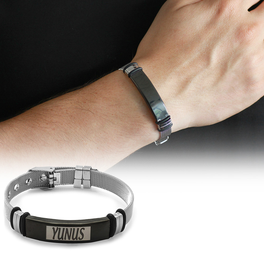 Siyah Zeminli İsme Özel Yazılı Uzunluk Ayarlı Gümüş Renk Çelik Erkek Hasır Bileklik - 1