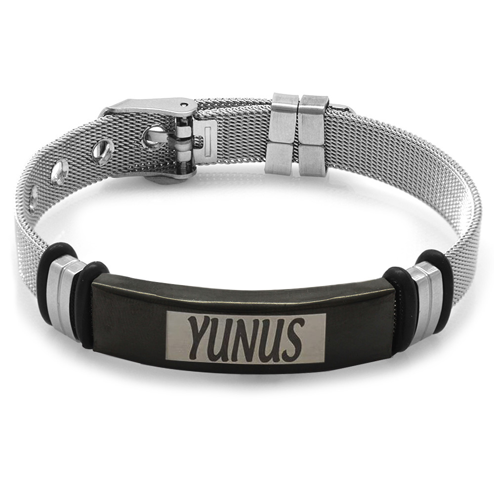 Siyah Zeminli İsme Özel Yazılı Uzunluk Ayarlı Gümüş Renk Çelik Erkek Hasır Bileklik
