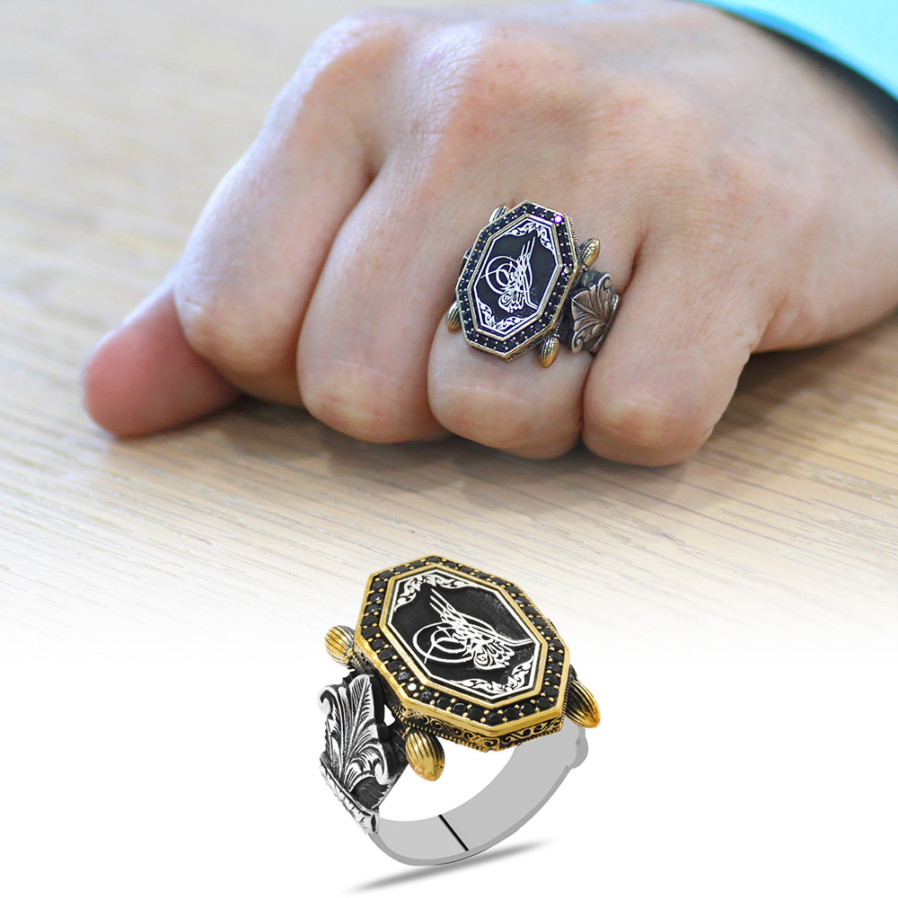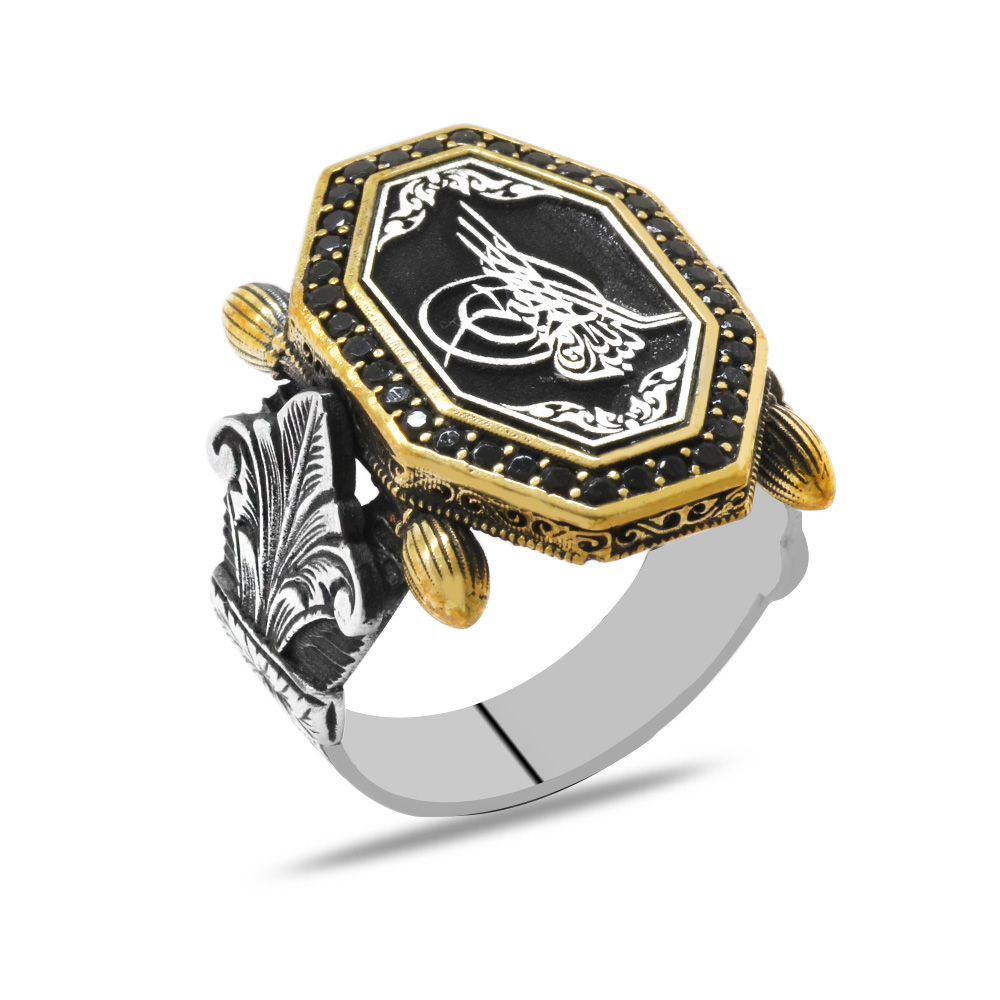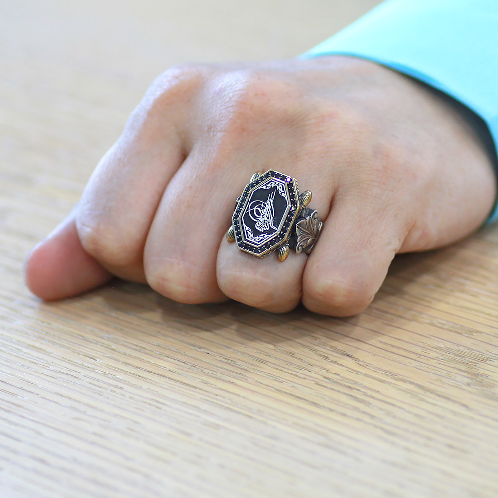 Siyah Zirkon Taş Mıhlamalı Tuğra Motifli Sekizgen Tasarım 925 Ayar Gümüş Erkek Yüzük