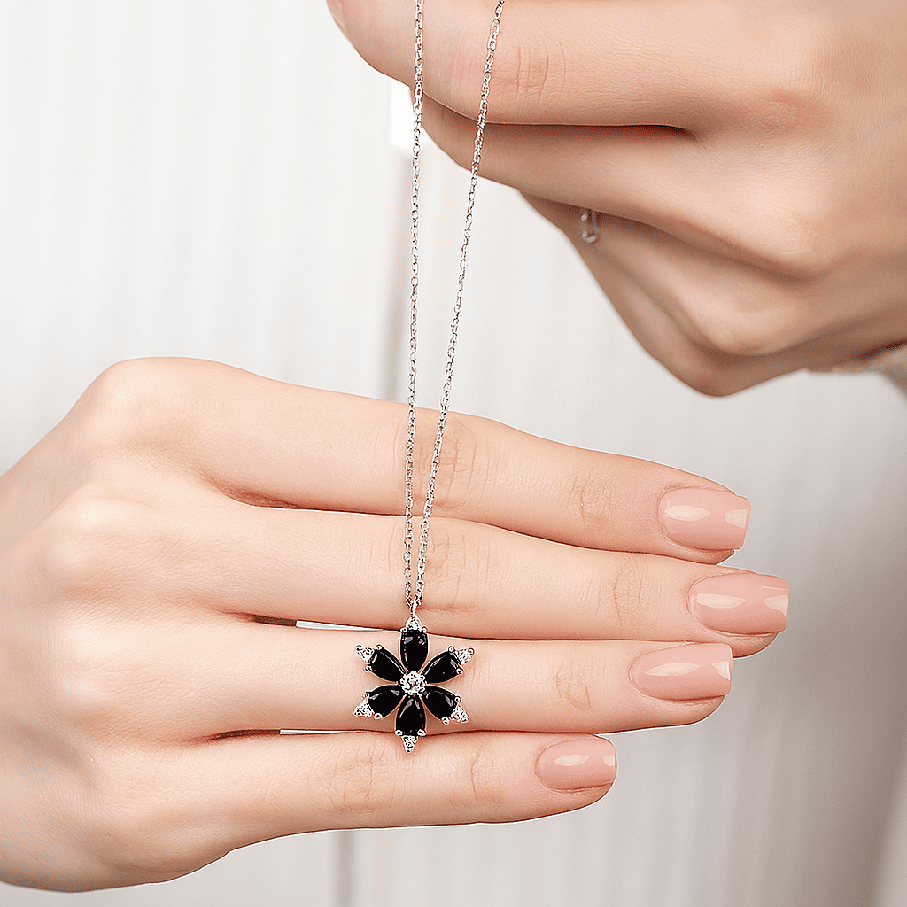 Siyah Zirkon Taşlı Kır Çiçeği Tasarım 925 Ayar Gümüş Kadın Kolye