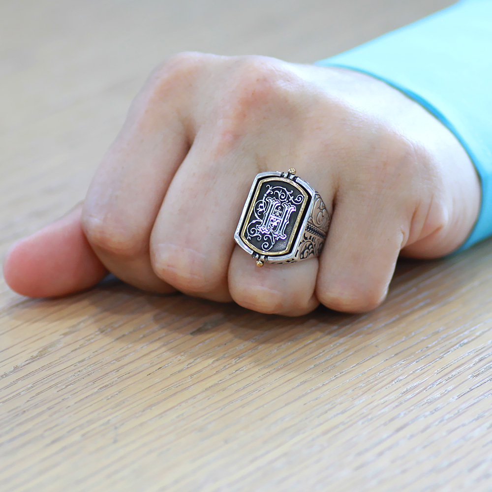 Siyah Zirkon Taşlı Mıhlamalı Çift Taraflı İsme Özel Harf Yazılı 925 Ayar Gümüş Erkek Yüzük