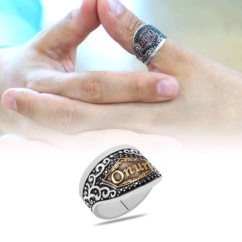 Siyah Zirkon Taşlı Mıhlamalı İsme Özel Yazılı 925 Ayar Gümüş Erkek Okçu Zihgir Yüzük