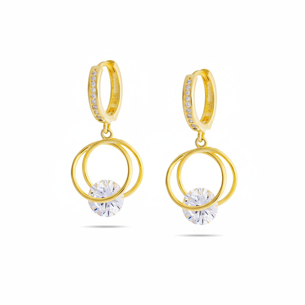 Elmas Görünümlü Tektaşlı Kalp Tasarım Altın Renk 925 Ayar Kadın Gümüş Sallantılı Küpe