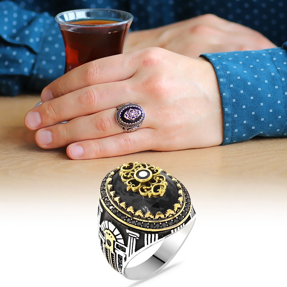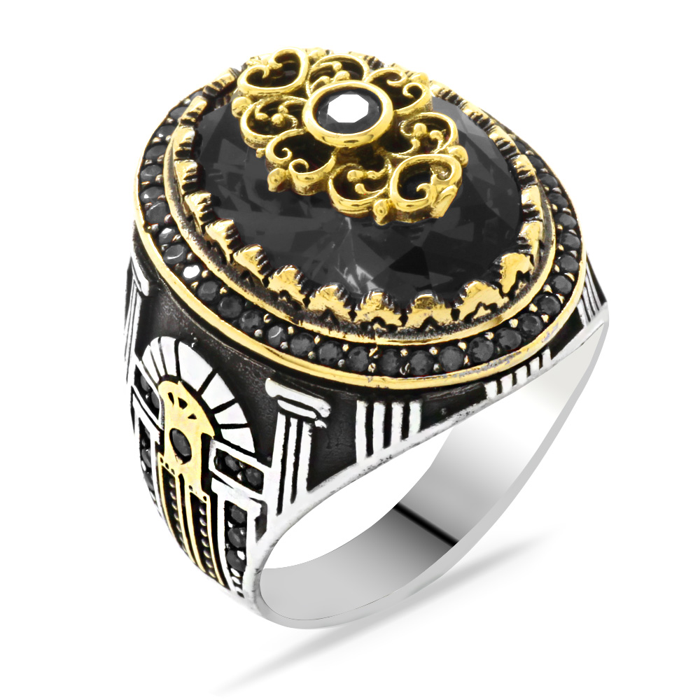 Sur Kapısı Temalı Faset Kesim Siyah Zirkon Taşlı 925 Ayar Gümüş Erkek Yüzük