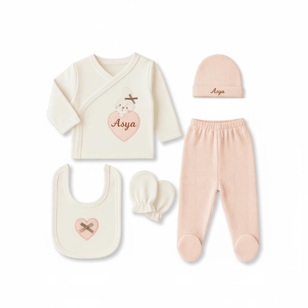 Tavşan Desenli İsme Özel Nakışlı Krem Pembe 5 li Yenidoğan Hastane Çıkış Bebek Takımı