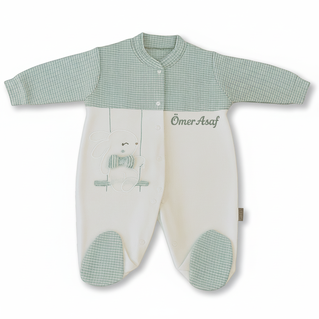 Tavşan Desenli İsme Özel Nakışlı Yeşil Beyaz Bebek Tulumu 0-3 Ay