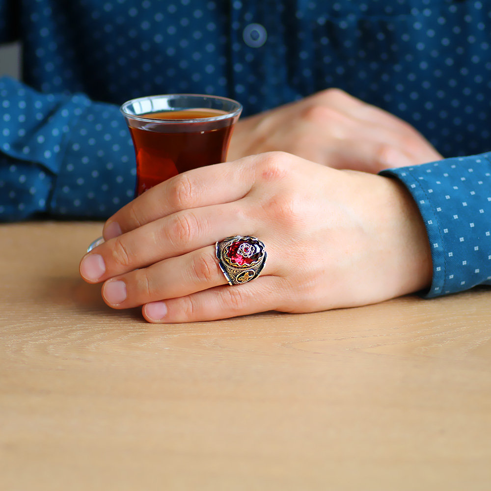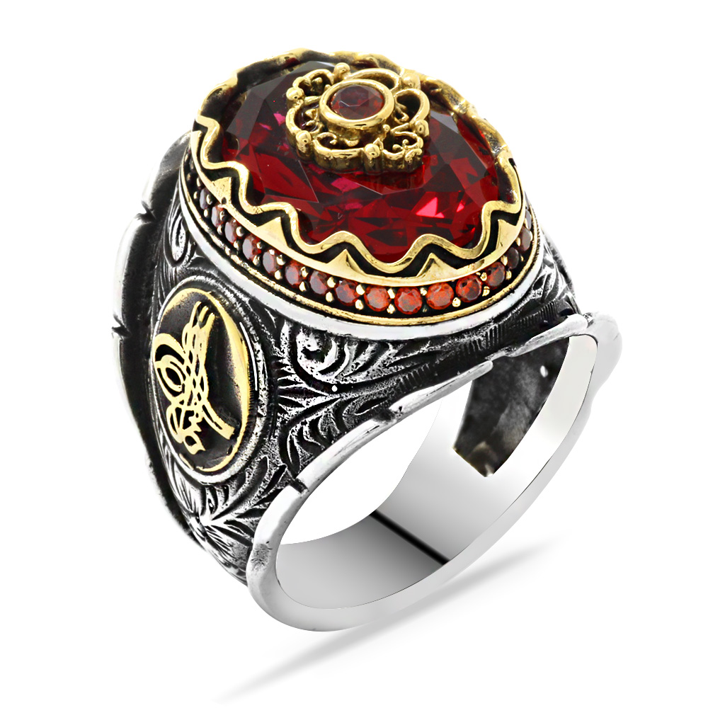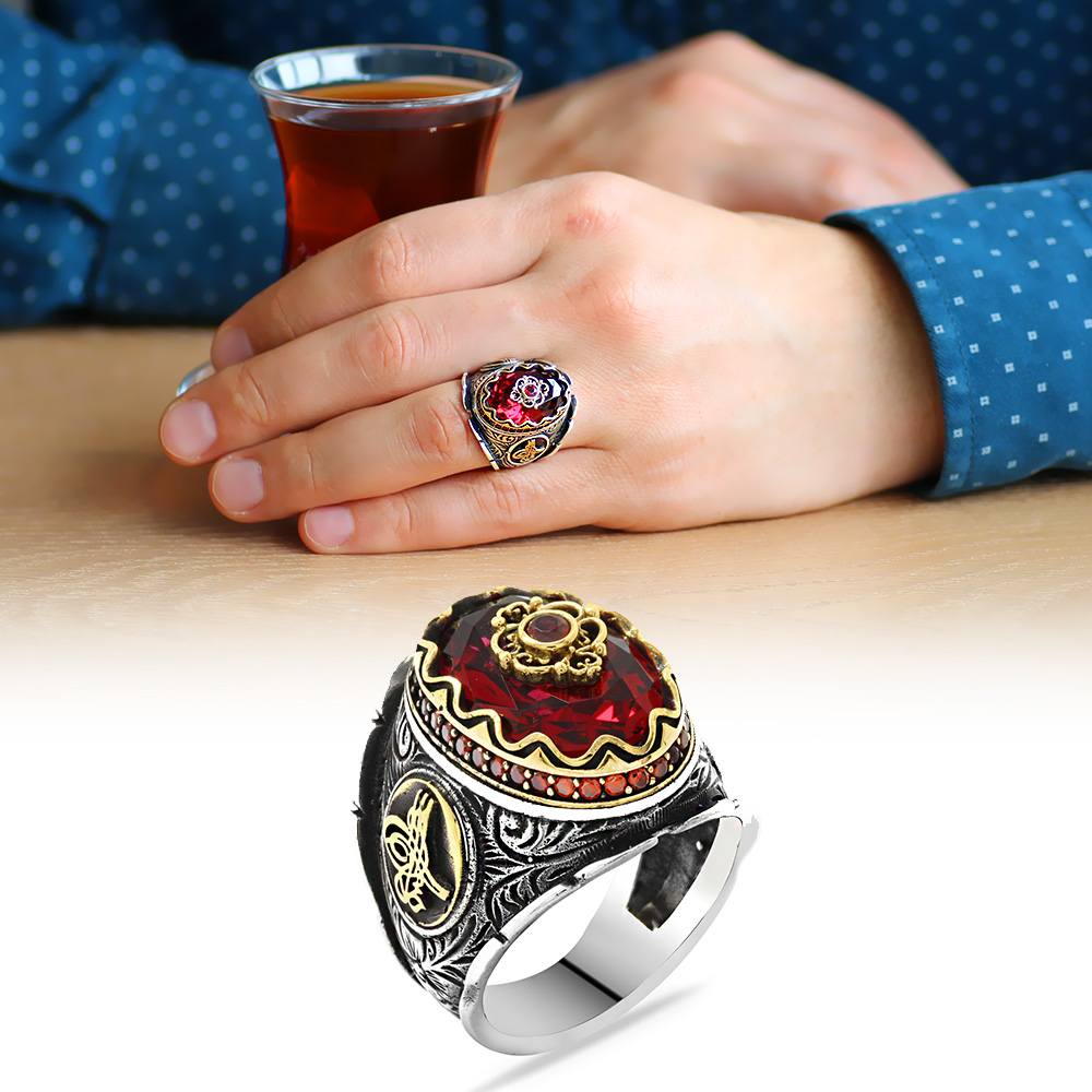Tuğra Figürlü Faset Kesim Kırmızı Zirkon Taşlı 925 Ayar Gümüş Erkek Yüzük