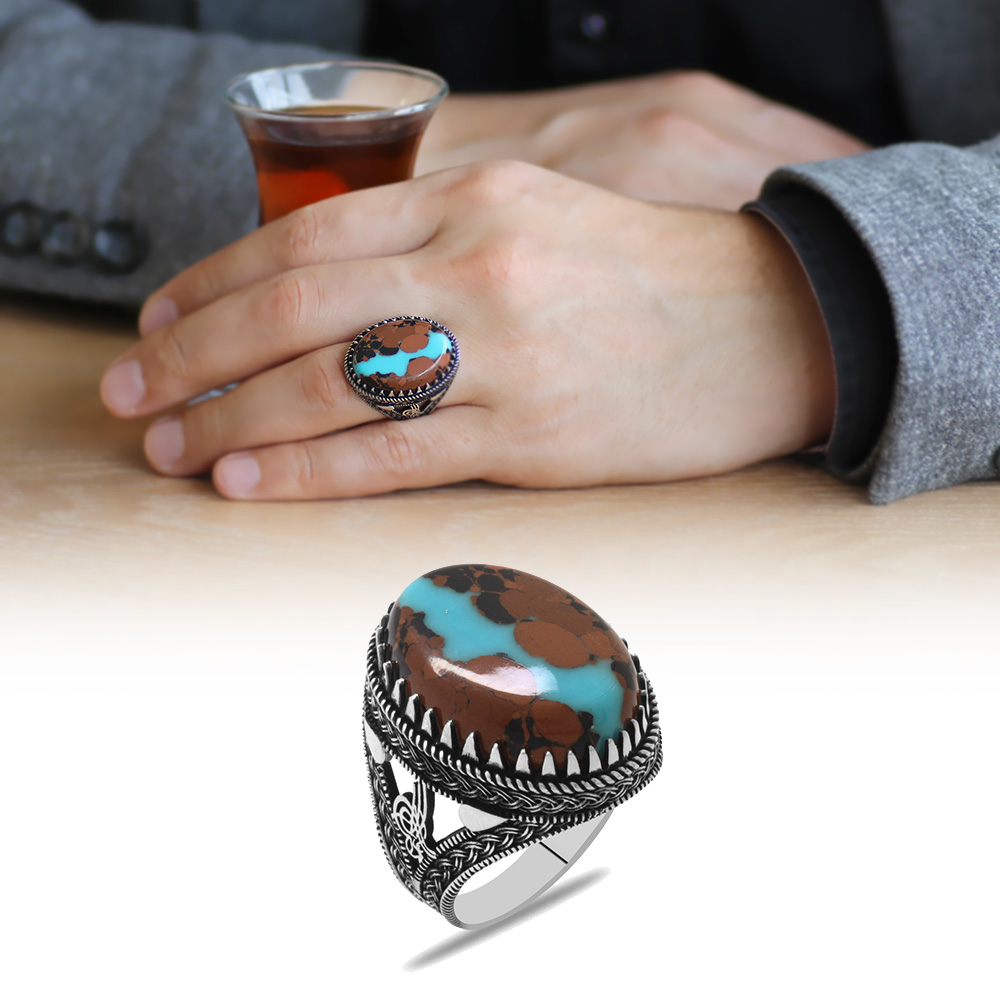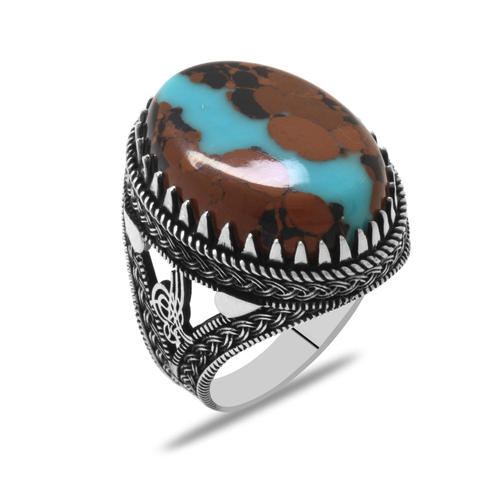 Tuğra Tasarım Doğal Arizona Turkuaz Taşlı 925 Ayar Gümüş Erkek Yüzük