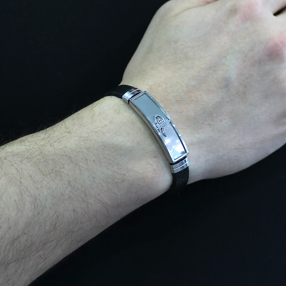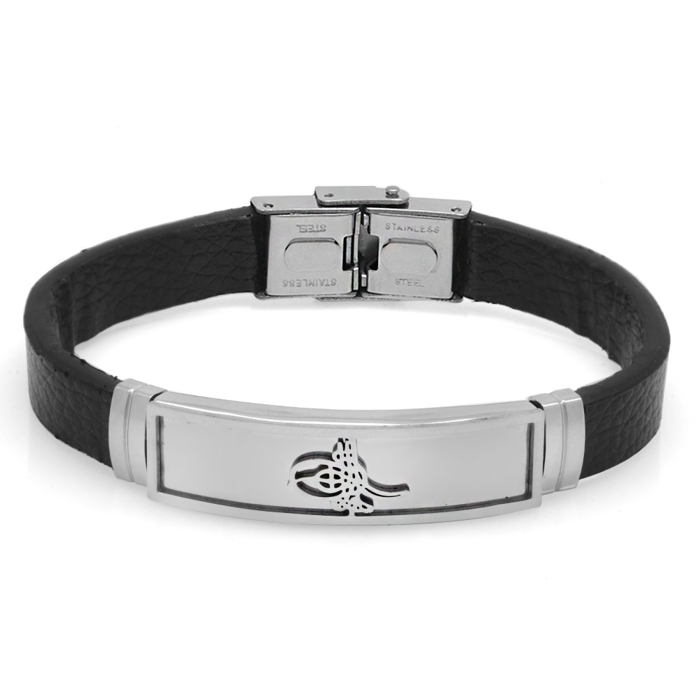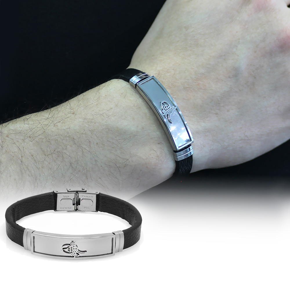 Tuğra Tasarım Siyah Deri Çelik Kombinli Erkek Bileklik
