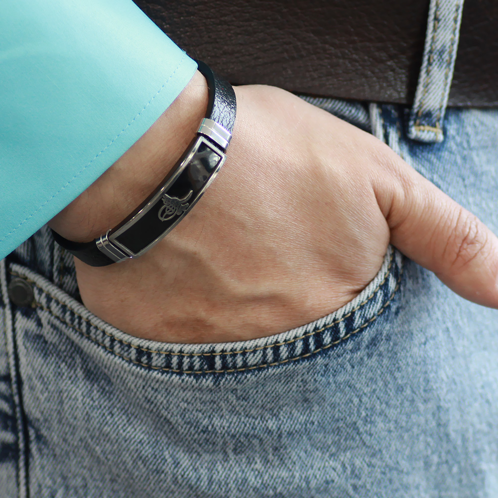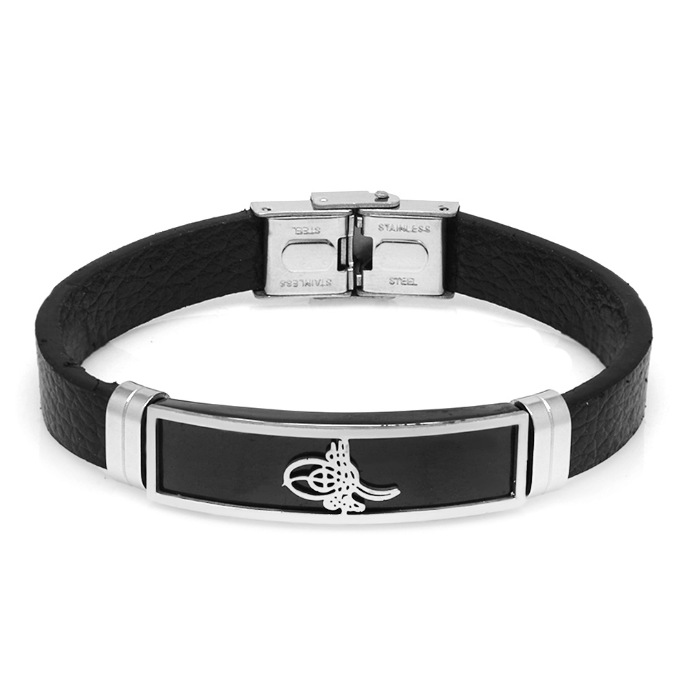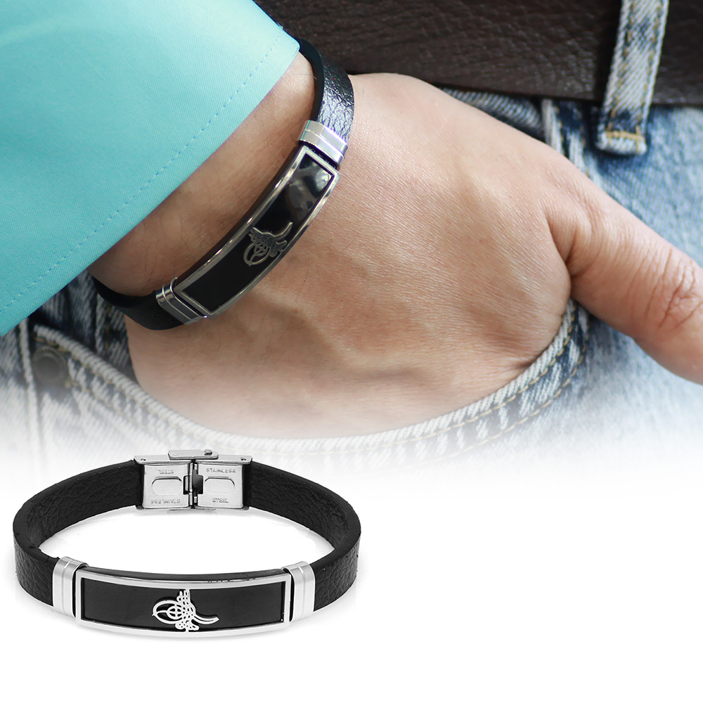 Tuğra Temalı Siyah Deri Çelik Kombinli Erkek Bileklik