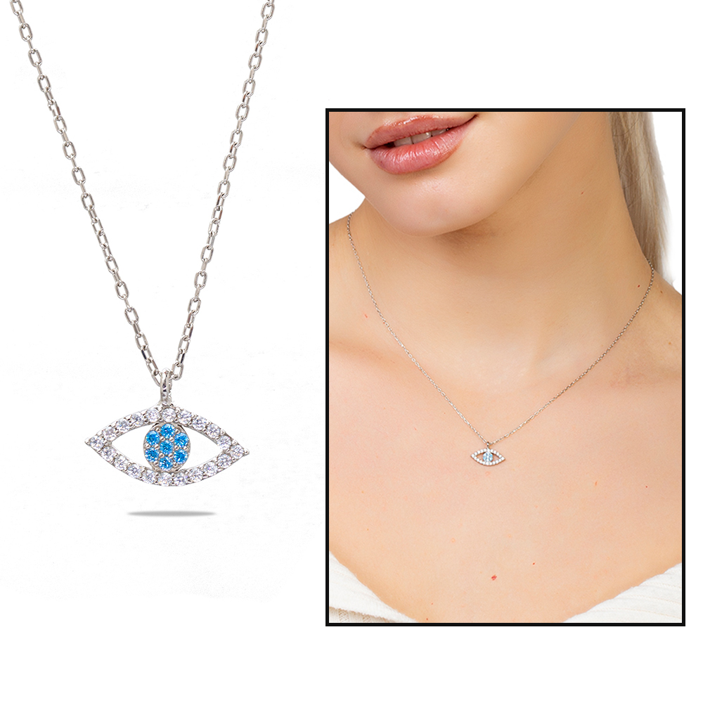 Turkuaz Beyaz Zirkon Taşlı Göz Tasarım Gümüş Renk 925 Ayar Gümüş Kadın Kolye