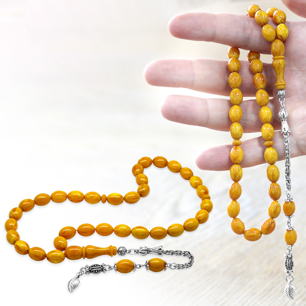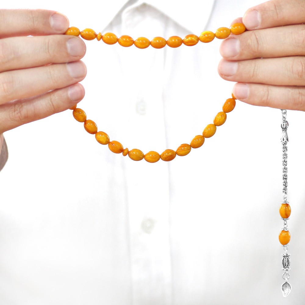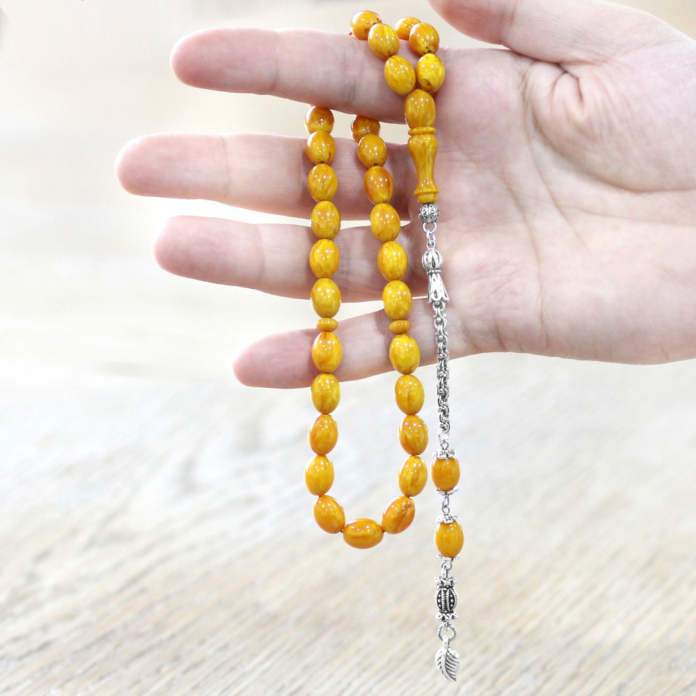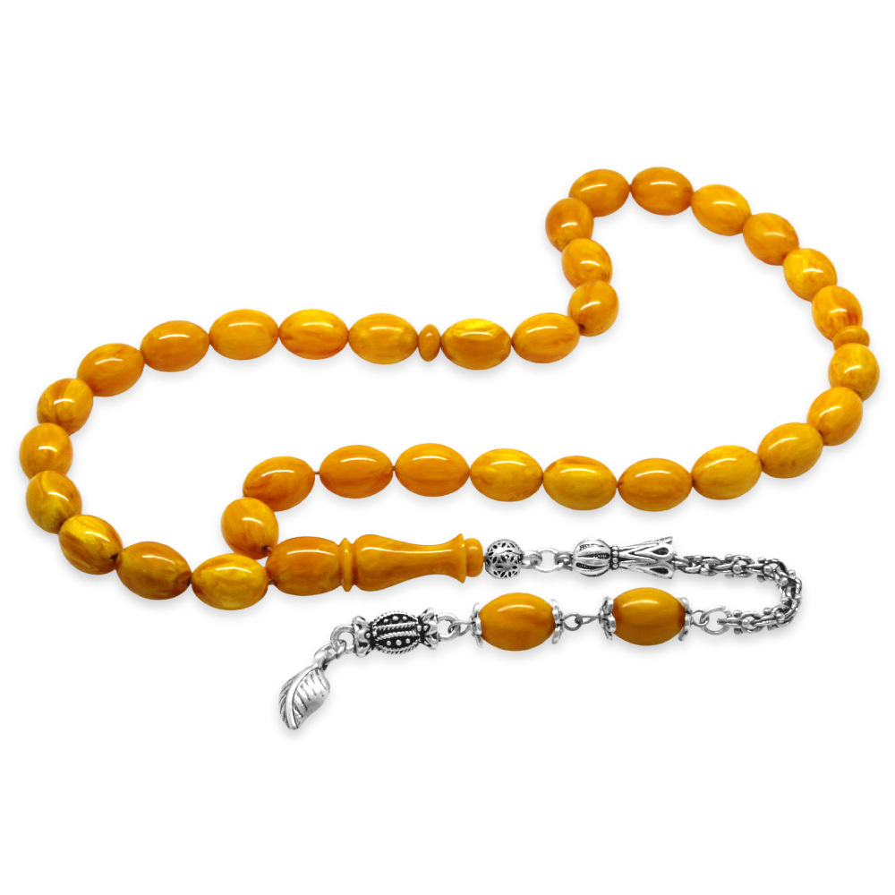 Yeni Döküm Katalin Tesbih - Kararmaz Metal Püsküllü - Hareli Portakal Sarısı Renk - Arpa Kesim