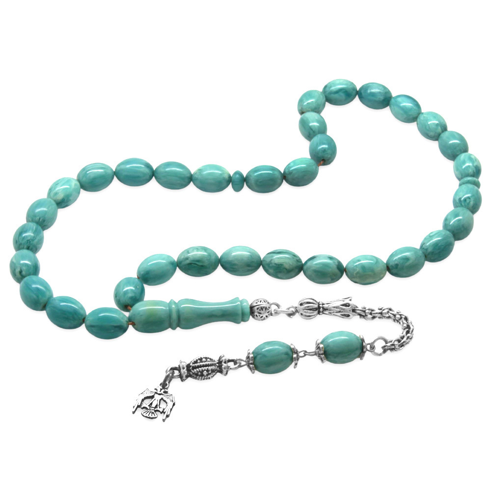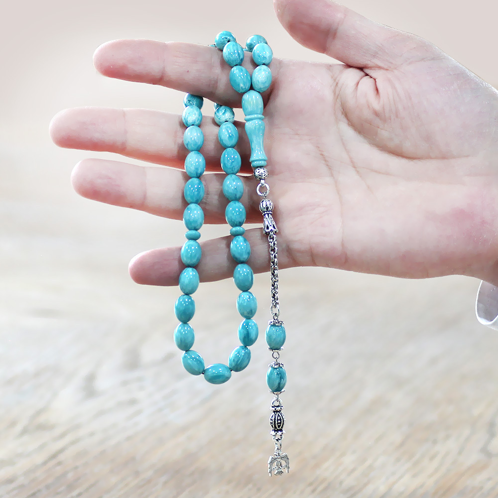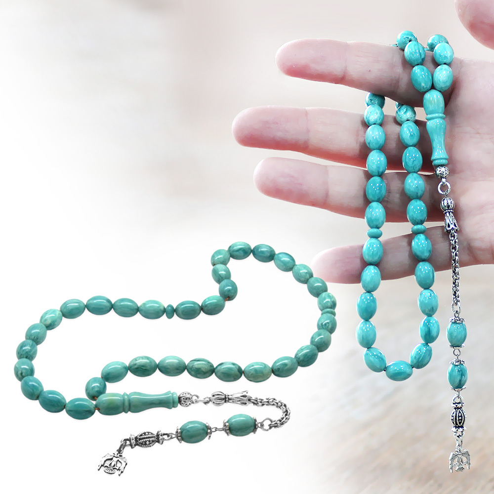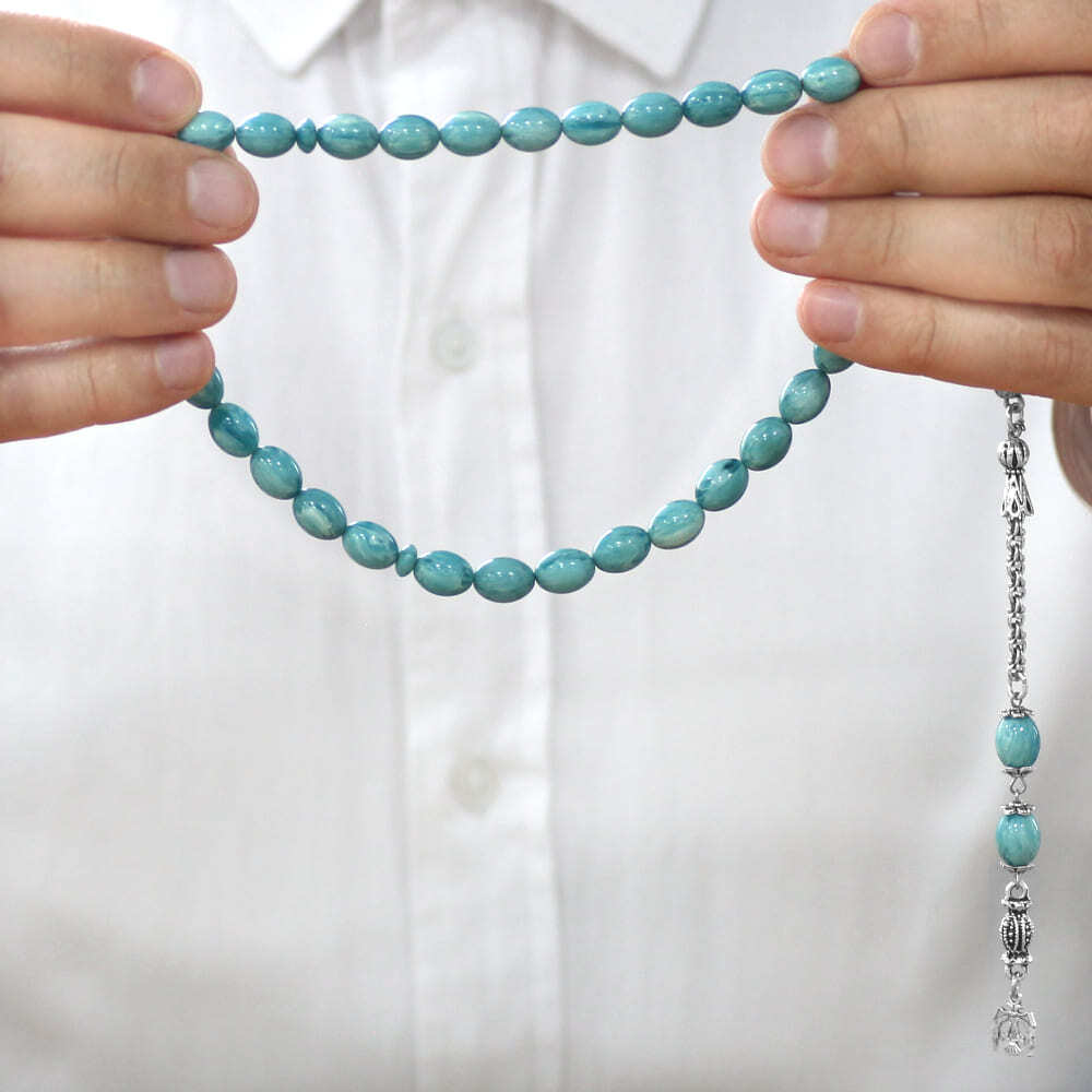 Yeni Döküm Katalin Tesbih - Kararmaz Metal Püsküllü - Hareli Turkuaz Beyaz Renk - Arpa Kesim